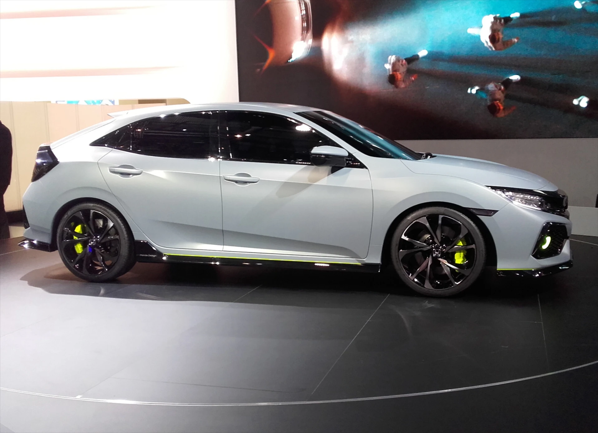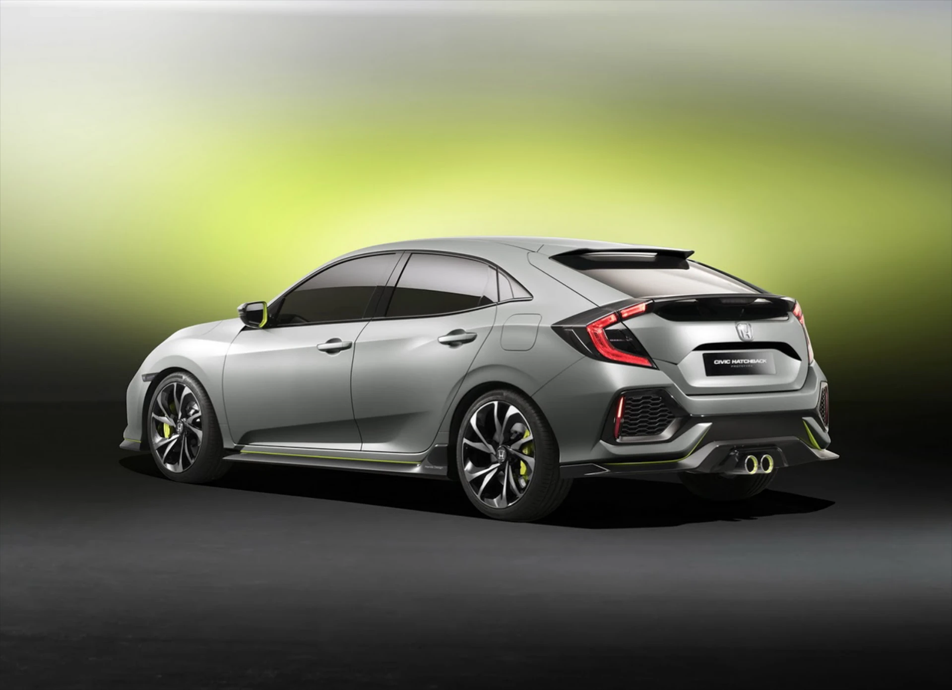 Το πρωτότυπο Civic έχει πιο επιθετική εμφάνιση, με χαμηλότερο ρύγχος, πιο λεπτά φωτιστικά σώματα και μεγάλες εισαγωγές αέρα και αεροδυναμικά βοηθήματα. Στο πίσω μέρος τα ιδιαίτερης σχεδίασης φωτιστικά σώματα LED, σε συνδυασμό με τη διπλή αεροτομή, στην οροφή και την κορυφή της πέμπτης πόρτα, αλλά και τις κεντρικά τοποθετημένες εξατμίσεις χαρίζουν αναμφίβολα μια ξεχωριστή εικόνα στο μοντέλο.