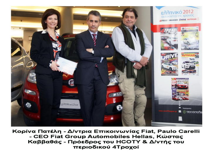 Ελληνικό Αυτοκίνητο της Χρονιάς 2012 ανακηρύχθηκε το νέο Fiat Panda (το οποίο οδηγήσαμε ήδη στην Ελλάδα). Στην εκδήλωση για την τελική φάση της ψηφοφορίας, που πραγματοποιήθηκε στο Ελληνικό Μουσείο Αυτοκινήτου, το Panda απέσπασε την πρώτη θέση με διαφορά 20 βαθμών από τον δεύτερο VW Up! Τρίτο ήρθε το Ford Focus. Το βραβείο για το Fiat Panda παρέλαβε ο Διευθύνων Σύμβουλος της Fiat Group Automobiles Hellas, κ. Paulo Carelli, ο οποίος εστίασε στη σημασία του βραβείου για τη Fiat: “Σας ευχαριστώ που τιμήσατε το Panda μ' ένα τόσο σημαντικό βραβείο, αυτό του Ελληνικού Αυτοκινήτου της Χρονιάς 2012, το οποίο παραλαμβάνω στο όνομα όλων όσων εργάζονται στη Fiat Group Automobiles, όχι μόνο στην Ελλάδα, αλλά και στην Ιταλία”.
