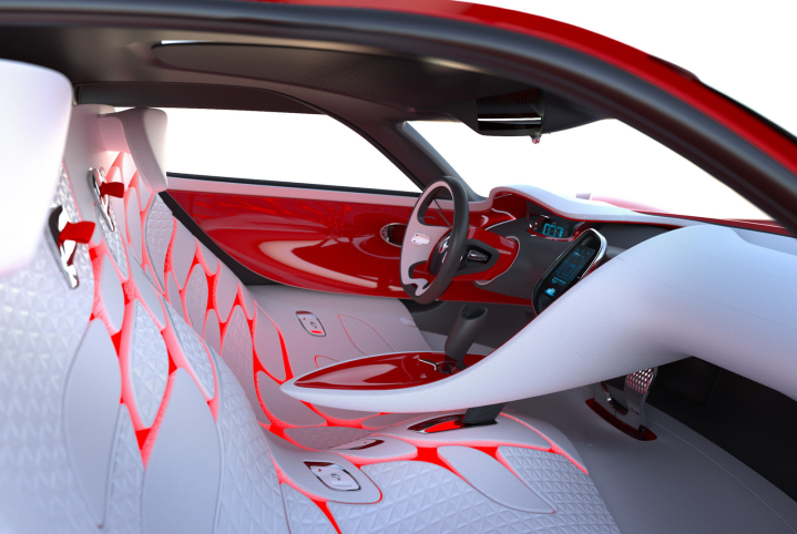 Αρκετά τμήματα του αμαξώματος είναι κατασκευασμένα από ανθρακονήματα περιορίζοντας το συνολικό βάρος στα 830 kg μόλις. Στο φουτουριστικό εσωτερικό το ενδιαφέρον κεντρίζει η κεντρικά τοποθετημένη θέση οδήγησης. Οι πόρτες, τέλος, ανοίγουν προς τα επάνω θυμίζοντας φτερά γλάρου.