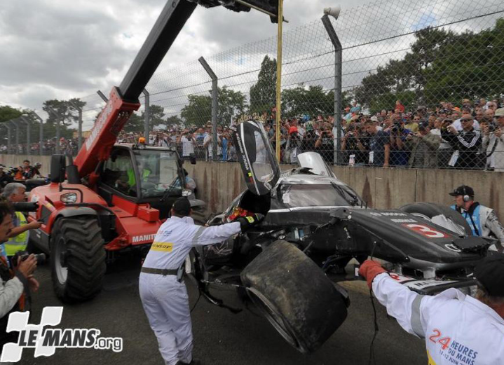 Την ανάσα των θεατών στον αγώνα έκοψε το σοβαρό ατύχημα του Allan McNish στην πρώτη ώρα, το Audi του οποίου ήρθε σε επαφή με την Ferrari του Anthony Beltoise (κατηγορία GTE Pro) και βγήκε εκτός πίστας. Το R18 TDI των περσινών νικητών έφερε τούμπες και σταμάτησε στον προστατευτικό τοίχο από ελαστικά, σχεδόν διαλυμένο, με κομμάτια του να πετάγονται προς φωτογράφους και θεατές. Ευτυχώς κανένας δεν τραυματίστηκε (από καθαρή τύχη όπως μπορείτε να δείτε στο παρακάτω video), συμπεριλαμβανομένου και του McNish που μέχρι εκείνη τη στιγμή προηγούνταν στον αγώνα. Το δεύτερο από τα τρία Audi είχε επίσης σοβαρό ατύχημα: εγκατέλλειψε την 8η ώρα όταν ο Mike Rockenfeller βγήκε εκτός δρόμου κατά την διάρκεια προσπέρασης της Ferrari (GTE Pro) του Robert Kaufmann.