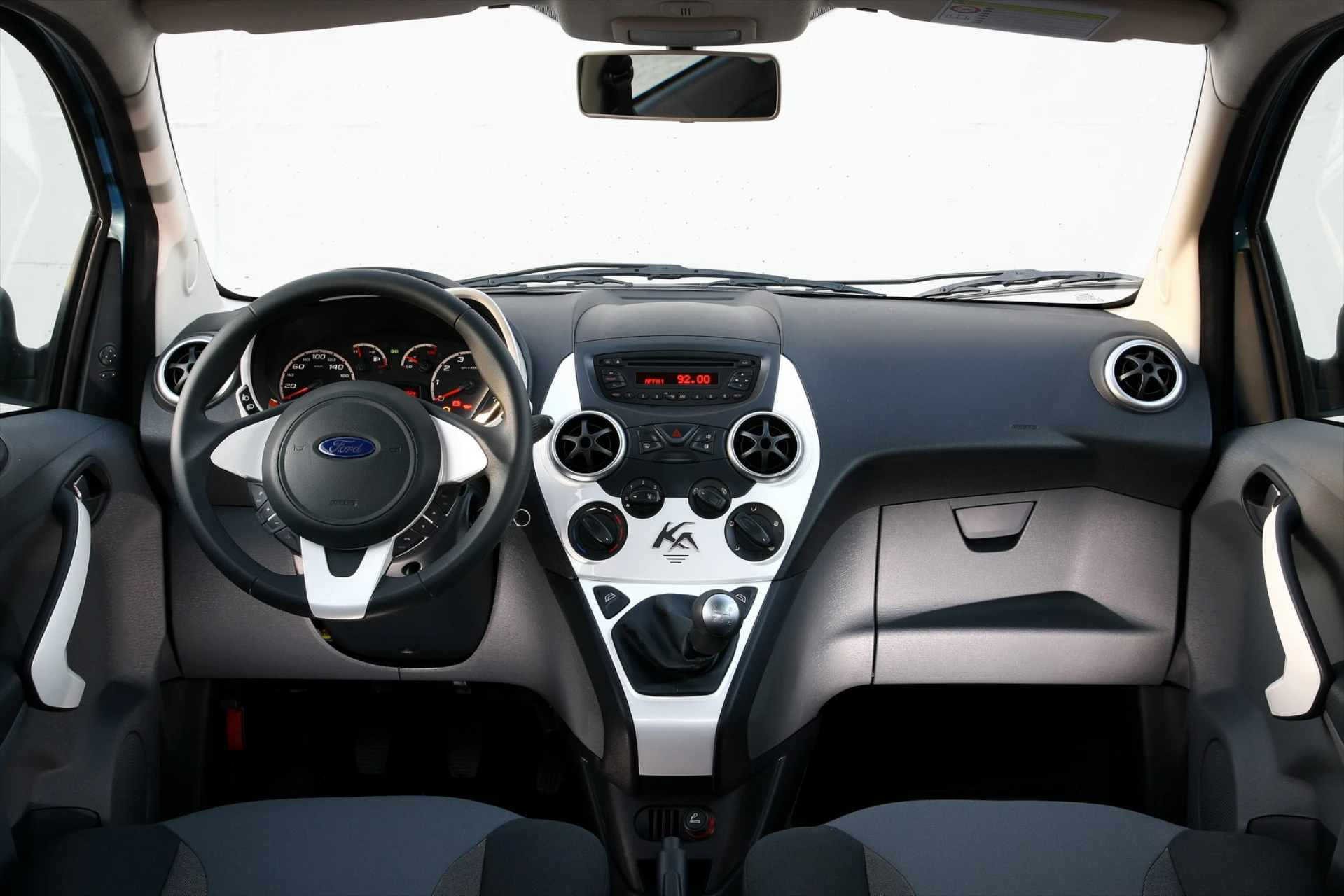 Στο εσωτερικό το Ka διατηρεί τον βαθμό συγγένειας με το 500 μόνο όσον αφορά την διάταξη στο ταμπλό, με τον επιλογέα τοποθετημένο ψηλά στην προέκταση της κονσόλας. Το ευμεγέθες λογότυπο άλλωστε σου υπενθυμίζει που βρίσκεσαι και σχεδιαστικά καταφέρνει να διαφοροποιηθεί με αποχρώσεις ανάλογες του αμαξώματος σε κονσόλα και τιμόνι, στρογγυλούς αεραγωγούς και την κλασική τετράδα οργάνων(κοντέρ, στροφόμετρο, δείκτες βενζίνης και θερμοκρασίας) με την νεανική γραμματοσειρά. Τα υλικά είναι σκληρά, αλλά καλοσυναρμολογημένα, ενώ χειριστήρια και διακόπτες θυμίζουν και λειτουργούν όπως συνηθίζεται στις κατασκευές της Ford. Αν εξαιρέσει κανείς τους διακόπτες των ηλεκτρικών παραθύρων που βρίσκονται εκατέρωθεν του λεβιέ ταχυτήτων, εργονομικά το Ka τα καταφέρνει περίφημα, με μικρούς αλλά υπαρκτούς αποθηκευτικούς χώρους και με ντουλαπάκι συνοδηγού(κάτι που απουσιάζει στο Fiat 500). Οι χώροι για τέσσερις ενήλικες επιβάτες είναι καλοί για το μέγεθος του αυτοκινήτου, ενώ και αυτός για τις αποσκευές με τα 224 lt αρκεί για τις καθημερινές ανάγκες.