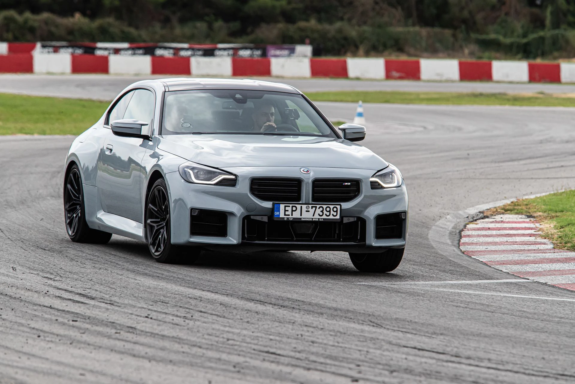 Κάθεσαι χαμηλά και πλέον βλέπεις τα φαρδιά καπούλια από τους πλαϊνούς καθρέπτες να σου κλείνουν το μάτι. Ο 3λιτρος τώρα γουργουρίζει πιο έντονα μιας και το κλαπέτο στην σπορ εξάτμιση με τις τέσσερις απολήξεις έχει ανοίξει. Βγαίνουμε από τα pits και η πρώτη έντονη επιτάχυνση έρχεται σαν χαστούκι για να σου πει «ξέχνα αυτά που ήξερες». Το μοτέρ πλέον βρυχάται και η M2 γεμίζει τις ταχύτητες την μία μετά την άλλη με αδιανόητη ευκολία. Το στιβαρό πλαίσιο σε παραπλανεί αρχικά και μία κλεφτή ματιά στο κοντέρ αρκεί για να σε κάνει να γουρλώσεις τα μάτια με την ένδειξη στο ταχύμετρο.