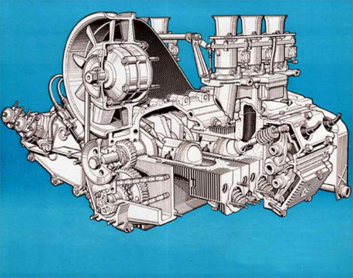 Ο κινητήρας φυσικά και ήταν αερόψυκτος, γιατί δεν θα πρέπει να ξεχνάμε ότι εκείνες τις ημέρες οι αποδόσεις και οι ρυθμοί περιστροφής δεν ήταν και πολύ υψηλοί και έτσι ο αέρας ακόμα ήταν αρκετός σαν μέσο ψύξης, ενώ δεν υπήρχαν περιοριστικές νομοθεσίες για τον θόρυβο και τους ρύπους. Αντίθετα η αερόψυξη είχε βασικά πλεονεκτήματα όπως πολύ πιο απλά καλούπια, αφού ουσιαστικά κάθε κύλινδρος αφαιρούνταν (και αντικαθίσταντο) ξεχωριστά και φυσικά δεν απαιτούσε ψυγείο νερού το οποίο αναγκαστικά είχε μετωπική επιφάνεια, άρα και αντίσταση. Στα κατά θα τοποθετούσαμε τον μη έλεγχο της θερμοκρασίας ο οποίος εξαρτιόταν από ένα ανεμιστήρα (που του έδινε τον ξεχωριστό ήχο) που κάθε άλλο παρά αρκετός ήταν στην αργή κυκλοφορία, αφού εξαρτιόταν από την ταχύτητα περιστροφής του στροφάλου και φυσικά το ότι δεν υπήρχε τρόπος να ζεστάνεις τη καμπίνα, παρά μόνο από τις εξατμίσεις! Έτσι για να κρατηθεί σταθερή η θερμοκρασία ο κινητήρας ήταν ουσιαστικά ελαιόψυκτος, αφού απαιτούνταν σχεδόν δώδεκα λίτρα λαδιού και ψυγείο εμπρός!