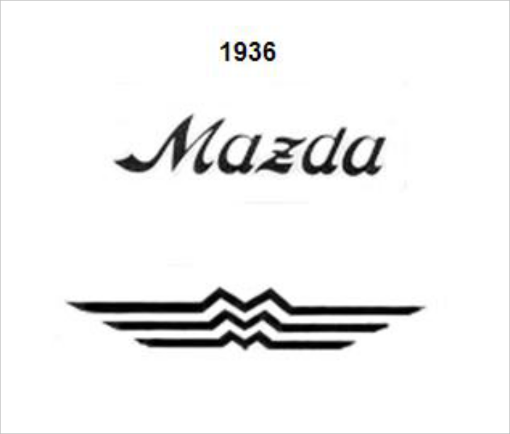 Το πρώτο λογότυπο της Mazda χρονολογείται από το 1936. Ήταν το σήμα κατατεθέν όταν ξεκίνησε η παραγωγή των τρίτροχων φορτηγών. Το όνομα «Mazda» προέρχεται από τον Ahura Mazda, θεό της σοφίας, της ευφυΐας και της αρμονίας, από τους αρχαιότερους πολιτισμούς της Δυτικής Ασίας. Λέγεται επίσης πως προήλθε από την αγγλοποιημένη εκδοχή του ονόματος Jujiro Matsuda, του ιδρυτή της αυτοκινητοβιομηχανίας της Mazda.