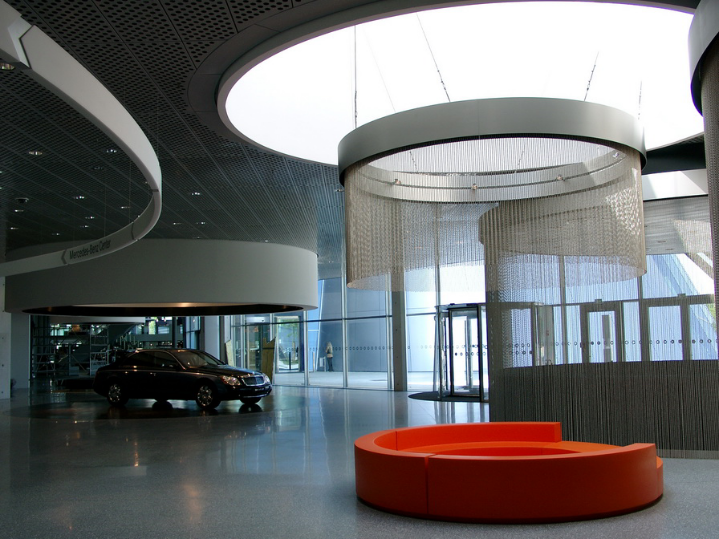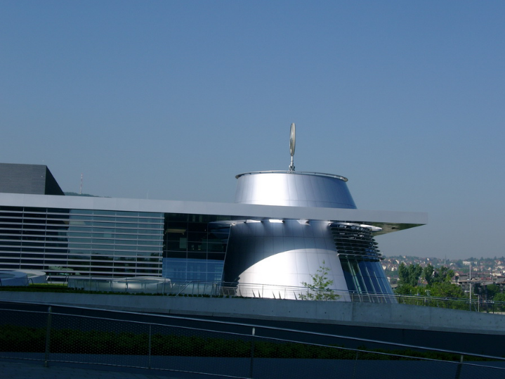 Μια αρχιτεκτονική διάταξη η οποία έχει περάσει και στην εξωτερική εμφάνιση του κτιρίου το οποίο δεσπόζει στην Autobahn. Με λείο τσιμέντο, μέταλλο και γυαλί (εδώ μια μικρή παρένθεση για να πούμε ότι κάθε κομμάτι γυαλιού είναι διαφορετικό, κομμένο επιτόπου στο χέρι) δείχνει απόλυτα γερμανικό, απόλυτα Mercedes, απόλυτα Metropolis (αν θυμάστε τη ταινία του Fritz Lang) και απόλυτα στηριγμένο πάνω σε ένα φιλοσοφικό υπόβαθρο. Δεν θα μπορούσε να ήταν τίποτα λιγότερο.