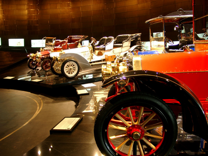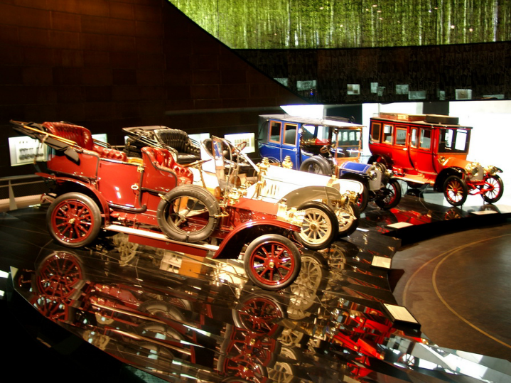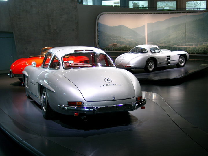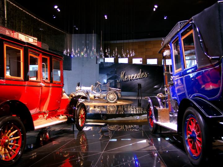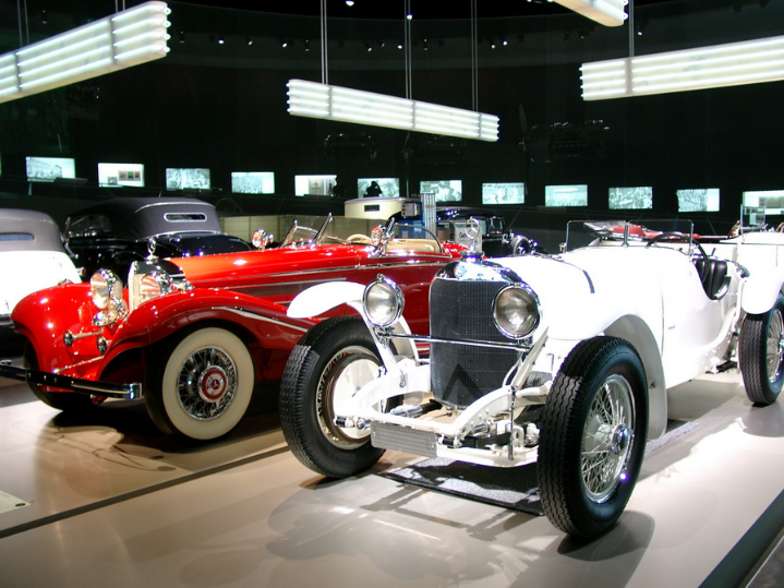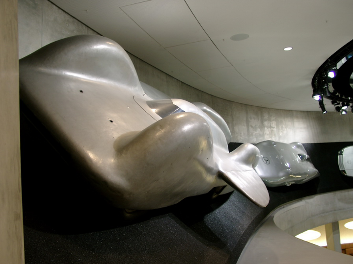 Ο μεγάλος κεντρικός χώρος που φυσικά ονομάζεται Atrium, που αποτελεί το κέντρο αναρρίχησης, είναι και το κέντρο ...στροβιλισμού των 120 ετών ιστορίας της Mercedes, ενώ ταυτόχρονα αποτελεί και το κέντρο πυρασφάλειας του κτιρίου. Διαθέτοντας μια μεγάλη τουρμπίνα αναρρόφησης στην οροφή έχει την δυνατότητα να τραβήξει το καπνό σε περίπτωση φωτιάς, ώστε να δώσει πολύτιμο χρόνο στους επισκέπτες να εκκενώσουν τον χώρο! Ανελκυστήρες «γαντζωμένοι» στους τείχους, με αισθητική art deco βγαλμένοι κατευθείαν από τον Flash Gordon, σε ανεβάζουν στο έβδομο επίπεδο προβάλλοντας ταυτόχρονα μέσω video εικόνες από την ιστορία της Mercedes καθώς ανυψώνονται. Φτάνοντας στον έβδομο εκεί σε καλωσορίζει τι άλλο, το άλογο που δίνει τη θέση του στο πρώτο όχημα που σχεδίασαν οι «πατέρες» της αυτοκίνησης σε μια αίθουσα εμπνευσμένη από την 2001-Οδύσσεια του Διαστήματος που σκηνοθέτησε ο Stanley Kubrick με τα οχήματα πάνω σε γυάλινη γαλακτώδη επιφάνεια φωτισμένη από κάτω. Μυρωδιές παλαιών συνεργείων αναδύονται από το χώρο καθώς αρχίζουμε την ελικοειδή κάθοδό μας στο χρόνο. Περνώντας εμπρός από τις πρώτες εφαρμογές του κινητήρα εσωτερικής καύσης στη γη στον αέρα και στο νερό φτάνουμε στην πιο εντυπωσιακή αίθουσα που δεν είναι άλλη από τη ουσιαστική γέννηση του αυτοκινήτου, τουλάχιστον έτσι όπως το ξέρουμε σήμερα, με τη Mercedes Simplex κάτω από τα απαστράπτουσα κρύσταλλα Swarofski. Ακολουθεί η αίθουσα με τα έργα τέχνης από το 1914 έως το 1945 για να φτάσουμε στα 1960 και τα δημιουργήματα των Hans Arp και για Oscar Niemeyer, βλέπε Gull wing, για να καταλήξουμε στα πιο γνωστά μας. Δεν χρειάζεται βέβαια να αναφέρουμε την ποιότητα των εκθεμάτων που είναι immaculate, ενώ τα καλύτερα επίθετα θα πρέπει να χρησιμοποιήσουμε για τα υλικά που έχουν χρησιμοποιηθεί και τους ενημερωτικούς πίνακες με τις ιστορικές αναδρομές. Όμως η αίθουσα στην οποία ...μείναμε ήταν αυτή με την αγωνιστική ιστορία της Mercedes, η οποία ζωντανεύει εμπρός σου με ήχους και εικόνες.