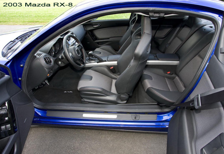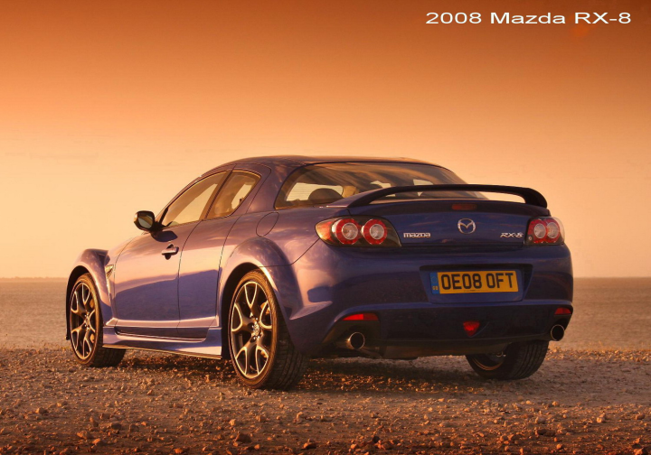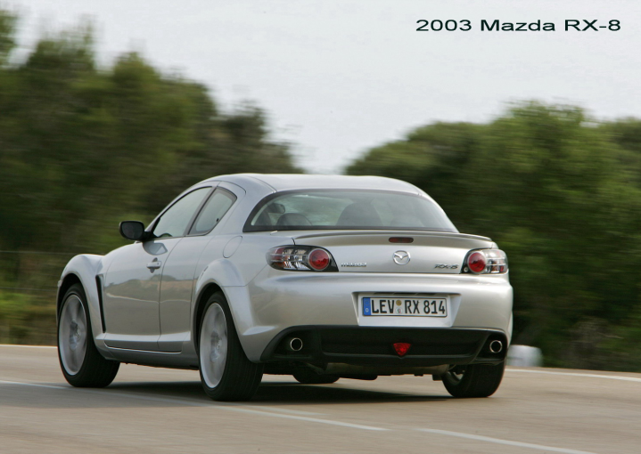 Το - πραγματικά - τετράθυρο και τετραθέσιο RX-8 αντιπροσώπευε την διορατικότητα και την καινοτομία της Mazda. Η εξέλιξή του επιβεβαίωσε ξανά την αξία της περιστρεφόμενης τεχνολογίας της εταιρείας, ενώ το design του εισήγαγε μια εντελώς νέα στυλιστική φιλοσοφία: τετραθέσιο, αθλητικό sport coupé αμάξωμα, χωρίς κεντρικές κολώνες, εξασφαλίζοντας την εύκολη πρόσβαση των επιβατών στις πίσω θέσεις. Ξεπερνώντας δύσκολες μηχανικές προκλήσεις, οι σχεδιαστές του RX-8 κατάφεραν να κατασκευάσουν ένα όμορφο, ελαφρύ, πρακτικό, ισχυρό και διασκεδαστικό sport coupé με απόλυτη 50:50 κατανομή βάρους. Ο σχεδιαστής του RX-8, Ikuo Maeda, τωρινός επικεφαλής σχεδίασης της μάρκας, βασίστηκε στο moto “αθλητική ένταση”. Τα χαρακτηριστικά στοιχεία του design είναι τα στρογγυλεμένα φτερά και οι δυναμικές γραμμές.