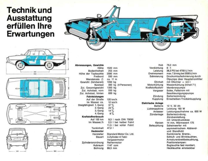 Τώρα γιατί επιλέχτηκε ο τετρακύλινδρος κινητήρας από το Triumph Herald 1200 των 1.147 κ.εκατ. και των μόλις 43 ίππων για ένα αυτοκίνητο που επρόκειτο να πουληθεί στην «μεγαλοπρεπή» αγορά των Η.Π.Α. αυτό είναι ένα μυστήριο. Όπως και να έχει δεν βοήθησε ούτε τις πωλήσεις, αλλά ούτε και τις επιδόσεις, παρά το γεγονός ότι το «770» δεν ήταν βαρύ στα 1.054 κιλά. Στο νερό με 7,0 knots ήταν αξιοπρεπές, φτάνει βέβαια το νερό να ήταν ήρεμο, ενώ στο δρόμο με την τελική ταχύτητα στα 110 χλμ./ώρα η κίνηση ήταν αργή. Αργότερα τοποθετήθηκαν κινητήρες 1.296 και 1.493 κ.εκατ. που έφτασαν τους 75 ίππους, όμως ήταν αργά για να αλλάξει κάτι.