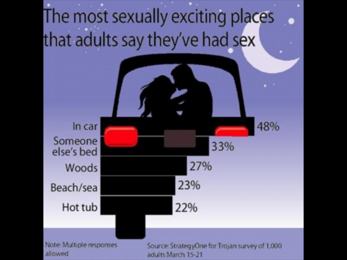 Ανάμεσα στα διάφορα μέρη για sex, το αυτοκίνητο συγκέντρωσε το 48% των προτιμήσεων του δείγματος των 3000 αμερικάνων πολιτών, λέγοντας ότι αποτελεί το πιο συναρπαστικό μέρος για ερωτική συναναστροφή. Αμέσως πιο χαμηλά σε προτιμήσεις με ποσοστό 33% είναι το κρεβάτι κάποιου άλλου προσώπου, το δάσος 27%, η παραλία-θάλασσα 23% και η μπανιέρα σε ποσοστό 22%.