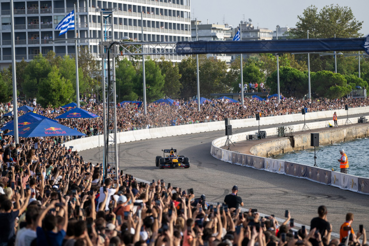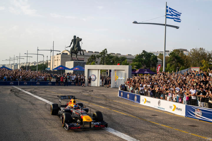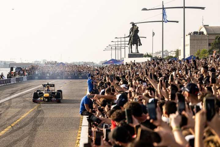 Ο κινητήρας μαρσάρει, η πύλη ανοίγει, ο Patrick Friesacher παίρνει την ελληνική σημαία στα χέρια του και το μονοθέσιο ξεχύνεται στην πίστα. Απόλυτη σιγή στο κοινό… μόνο ο εκκωφαντικός ήχος του κινητήρα V8 των 750 ίππων ηχούσε σε όλη την πόλη. Οι καρδιές όλων χτύπησαν δυνατά, η αδρεναλίνη στο κόκκινο και το θέαμα απλά μαγευτικό! Donuts και εντυπωσιακές επιταχύνσεις γέμισαν τη Νέα Παραλία, που είχε μετατραπεί σε πίστα για την εμβληματική RB8.