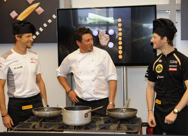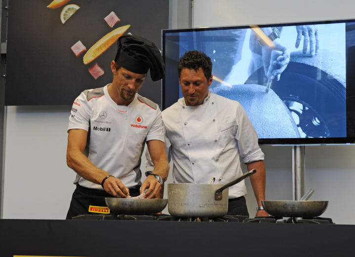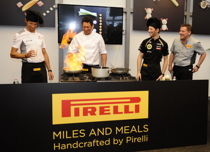 Από τα μονοθέσια της Formula 1 στην κουζίνα. Οι Jenson Button και Romain Grosjean έβγαλαν για λίγο τη φόρμα του πιλότου F1 και φόρεσαν την ποδιά του… σεφ, συμμετέχοντας σε αγώνα μαγειρικής υπό το έμπειρο βλέμμα του Paul Hembery, του αγωνιστικού διευθυντή της Pirelli. Η προσπάθεια των δύο οδηγών και η γευσιγνωσία μερικών γαστρονομικών σπεσιαλιτέ από το motorhome της Pirelli αποτέλεσαν το σκηνικό παρουσίασης του “Miles & Meals – handcrafted by Pirelli”: ενός βιβλίου μαγειρικής που αποκαλύπτει τα μυστικά των σεφ της Pirelli και εισέρχεται στο άδυτο του έμπειρου προσωπικού της.