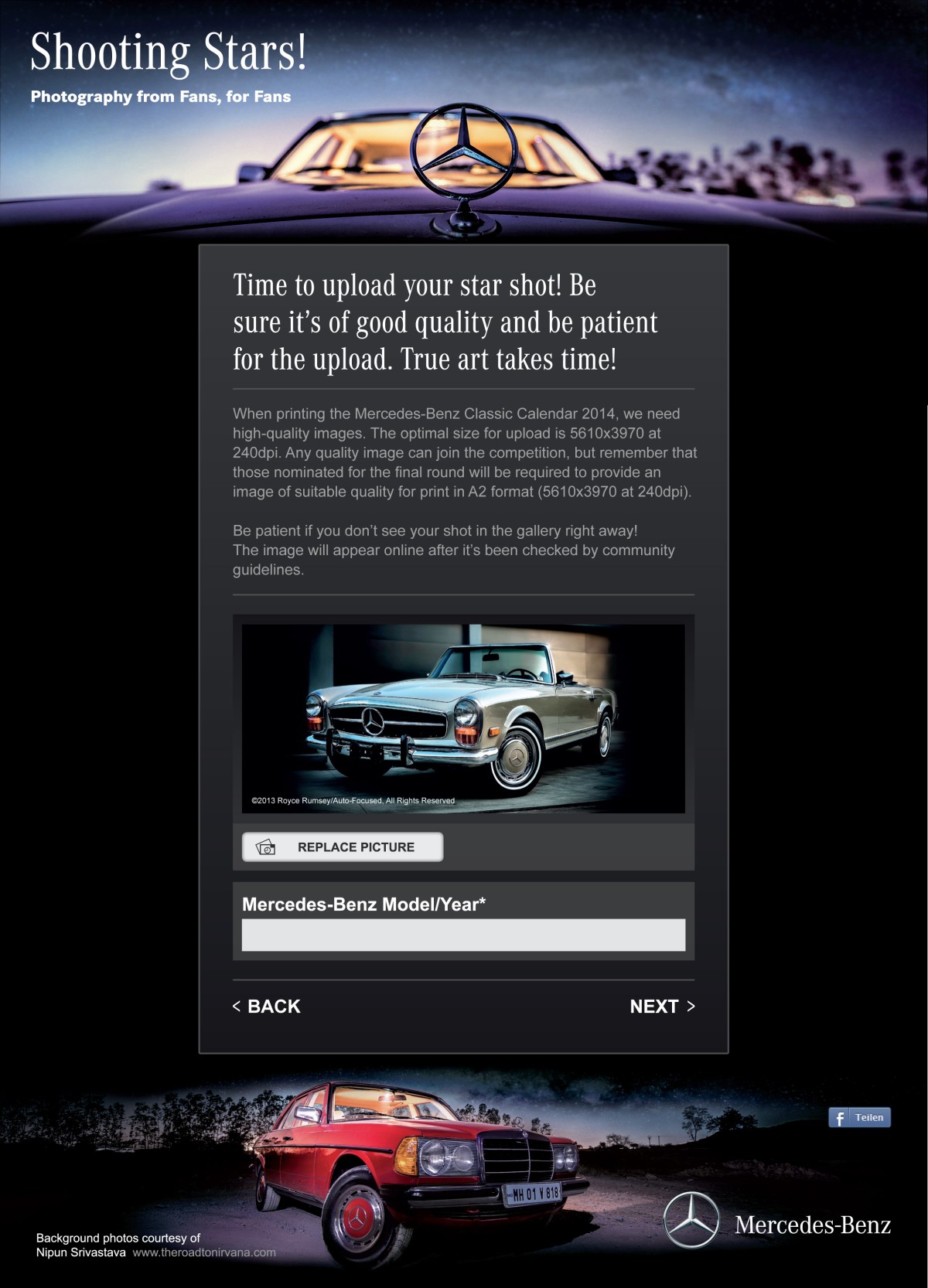 Η Mercedes-Benz ψάχνει για δώδεκα εξαιρετικές φωτογραφίες για το ημερολόγιο κλασικών αυτοκινήτων του 2014. Το μόνο που χρειάζεται είναι μία φωτογραφική μηχανή, έμπνευση και πρόσβαση στο Facebook. Επιλέγετε τη φωτογραφία του vintage ή «νέου κλασικού» (κατασκευασμένου πριν το 1994) αυτοκινήτου που θέλετε να συμμετέχει και την «ανεβάζετε» χρησιμοποιώντας μια εφαρμογή στη σελίδα του Μουσείου της Mercedes-Benz στο Facebook (http://www.facebook.com/mercedesbenzmuseum) έως τις 23 Ιουλίου 2013.