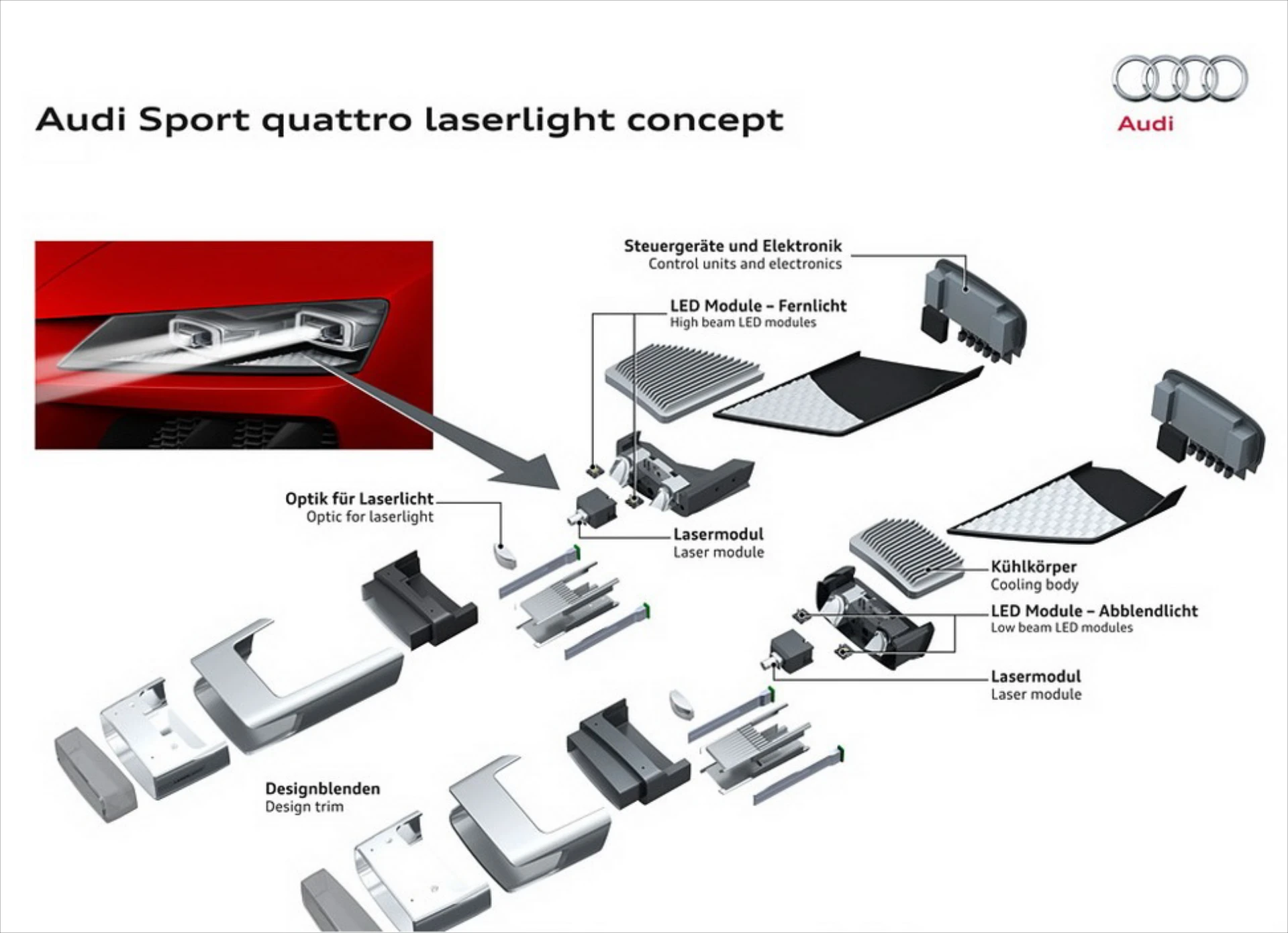 Από τον ήλιο στη φωτιά, στη λάμπα πυρακτώσεως και από εκεί στα Xenon, τα LED και τα Matrix LED. Το επόμενο βήμα ακούει στην ονομασία Laser light, την τεχνολογία που παρουσίασε η Audi στην έκθεση CES 2014 (Consumer Electronics Show) ενσωματωμένη στο πρωτότυπο Audi Sport quattro laserlight concept. Τα νέα φώτα καλύπτουν απόσταση 500 μέτρων, διπλασιάζοντας την απόδοση των μεγάλων προβολέων LED (μεγάλη σκάλα φωτων)! Οι Γερμανοί παρουσιάζουν την εξέλιξη του φωτός με εντυπωσιακό τρόπο στο παραπάνω video.