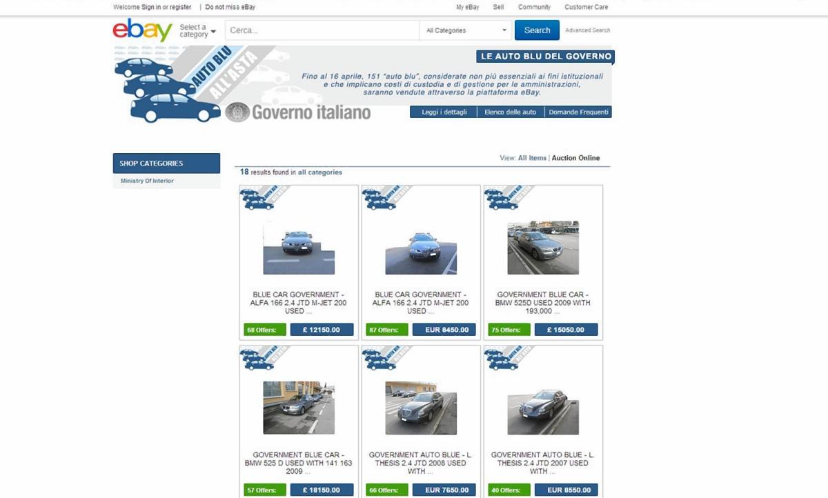 Η Ιταλική κυβέρνηση θα βγάλει προς πώληση 151 από τα αυτοκίνητα που χρησιμοποιούν οι κρατικές υπηρεσίες. Ο πρωθυπουργός της χώρας Matteo Renzi αποφάσισε να μειώσει τις δαπάνες εκποιώντας τα αυτοκίνητα που έχει για τις ανάγκες του το υπουργείο Εσωτερικών. Συνολικά 151 αυτοκίνητα θα βγουν σύντομα προς πώληση στο eBay εκ των οποίων τα περισσότερα είναι Alfa Romeo και Lancia, ωστόσο υπάρχουν και κάποια λίγα μη ιταλικής προελεύσεως όπως BMW και Jaguar. Εκτιμάται ότι στην Ιταλία κυκλοφορούν 59.000 κρατικά αυτοκίνητα, οπότε τα 151 δεν θα μειώσουν και πολύ τις δαπάνες των αξιωματούχων.