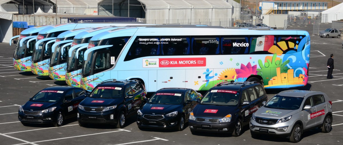 Η Kia, ως “Official Automotive Partner“ της FIFA παρέδωσε με ειδική τελετή 410 υπηρεσιακά οχήματα για τις ανάγκες του 2014 FIFA World Cup της Βραζιλίας. Ο στόλος που θα χρησιμοποιηθεί στη μεταφορά των ομάδων, των υπαλλήλων, των εκπροσώπων καθώς και των επισήμων επισκεπτών VIP από όλο τον κόσμο κατά την διάρκεια του Παγκοσμίου Κυπέλλου 2014 της FIFA, περιλαμβάνει μεταξύ άλλων το Sportage, καθώς και το MPV Carnival, γνωστό και ως Sedona σε κάποιες χώρες. Εν τω μεταξύ, στην πορεία προς την φετινή διοργάνωση, η Kia έχει ήδη διαθέσει 93 οχήματα για την προετοιμασία της διοργάνωσης. Εκτός από τα υπηρεσιακά οχήματα, μια «ομάδα οδικής βοήθειας Kia» θα είναι διαθέσιμη όλο το 24ωρο καθ’ όλη την διάρκεια της εκδήλωσης. Η ομάδα θα παρέχει διάφορες υπηρεσίες έκτακτης ανάγκης για να εξασφαλίσει την άνεση και την ασφάλεια των οδηγών και των επιβατών των υπηρεσιακών οχημάτων.