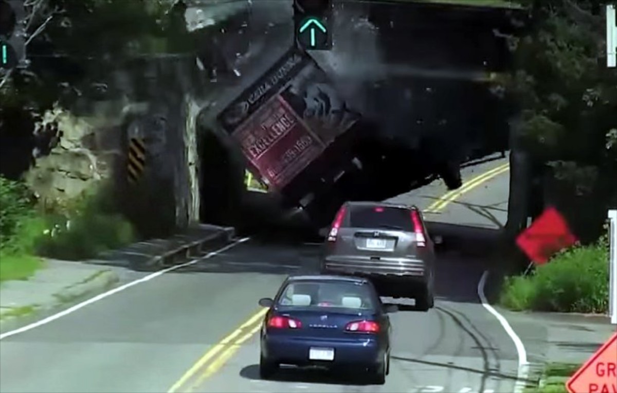 Όλοι (;) ξέρουμε πως στις γέφυρες υπάρχει όριο ύψους για τα οχήματα που περνούν από κάτω. Τι γίνεται όταν ένα φορτηγό είναι ψηλότερο από το πέρασμα; Η απάντηση στα παραπάνω video από το Westwood της Μασαχουσέτης, όπου από ότι φαίνεται είναι συχνό το φαινόμενο φορτηγά να αφήνουν τα κομμάτια τους πάνω στη συγκεκριμένη γέφυρα, παρά τη σχετική σήμανση που υπάρχει. Μάλιστα, σύμφωνα με τοπικό κανάλι τα τελευταία 5 χρόνια 43 (ναι, σαράντα τρία) φορτηγά χτύπησαν πάνω στη γέφυρα! Σκέψου να οδηγείς μοτοσυκλέτα και να είναι πίσω από ένα τέτοιο φορτηγό… Τρόμος!
