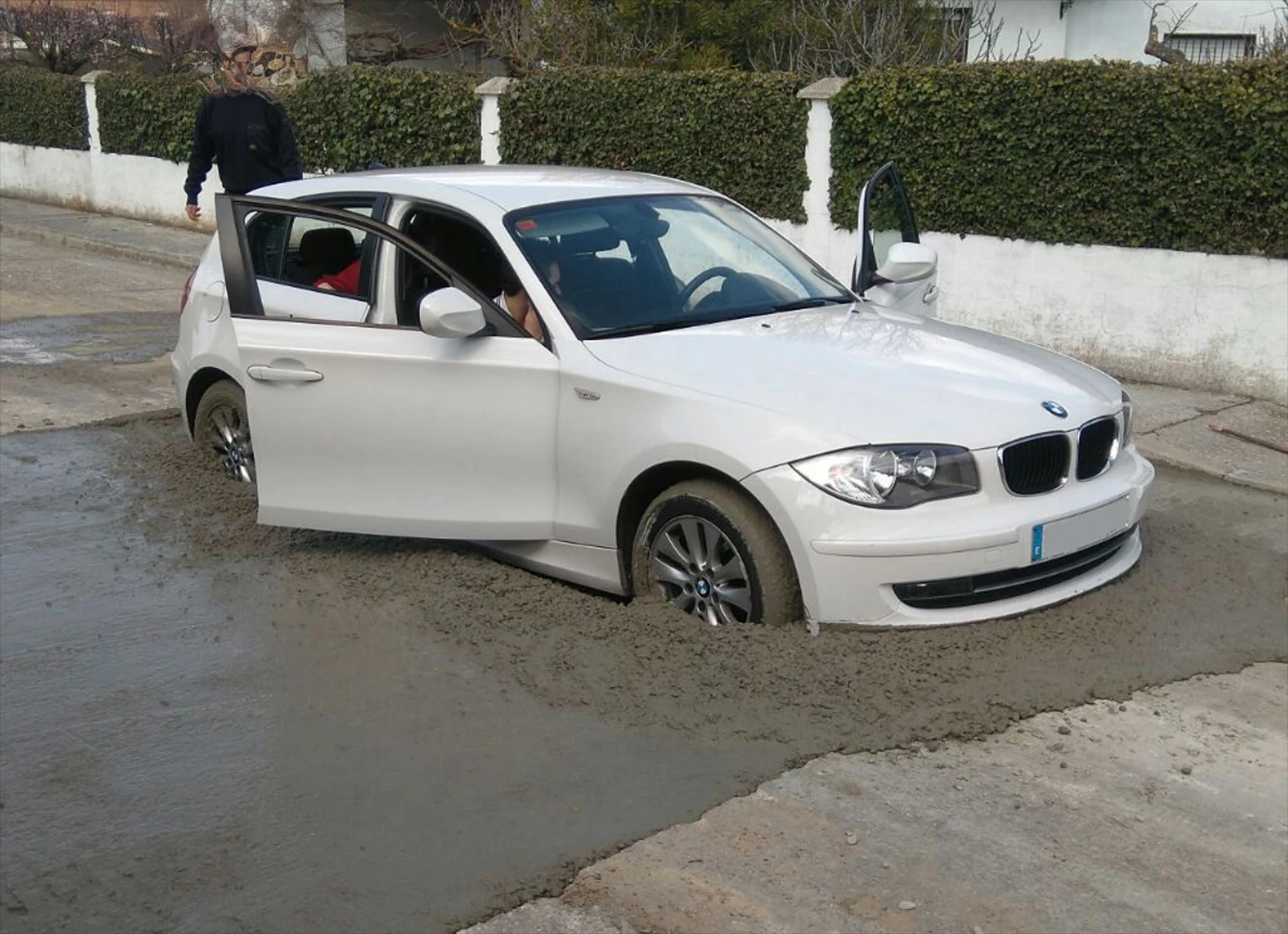 Δυστυχώς όμως για αυτόν έκαναν έργα και είχαν ρίξει φρέσκο τσιμέντο από εκεί που θα πέρναγε, έχοντας βάλει μια μικρή ειδοποίηση, την οποία προφανώς δεν είδε. Το αποτέλεσμα ήταν να πέσει μέσα και με τους τέσσερις τροχούς, όπως μπορείτε να δείτε και στη φωτογραφία. Ευτυχώς για αυτόν, μέσα στην ατυχία του, είχε τη βοήθεια των εργατών, οι οποίοι έβαλαν ένα χεράκι για να ξεκολλήσει πριν το τσιμέντο στερεοποιηθεί. Τώρα… γρήγορα στο πλυντήριο.