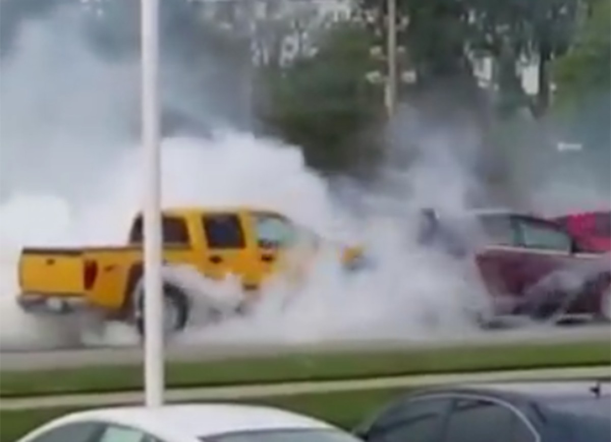 Ένα Chevrolet Colorado χρησιμοποιεί ένα Ford C-Max για να κάνει ένα απίστευτο burn out. Σύμφωνα με τον τίτλο και την περιγραφή του βίντεο, ο οδηγός μέσα στο κίτρινο αυτοκίνητο έχει κοιμηθεί με το πόδι να έχει κολλήσει στο δεξί πεντάλ. Ωστόσο δεν είναι απίθανο να έχει χάσει για κάποιον σημαντικότερο λόγο τις αισθήσεις του και το αποτέλεσμα ήταν να μην έχει καμία επαφή με τον κόσμο. Το αποτέλεσμα ήταν να προκαλέσει πανικό στους περαστικούς, ενώ δεν μπόρεσαν να αντιληφθούν αμέσως περί τίνος πρόκειται.