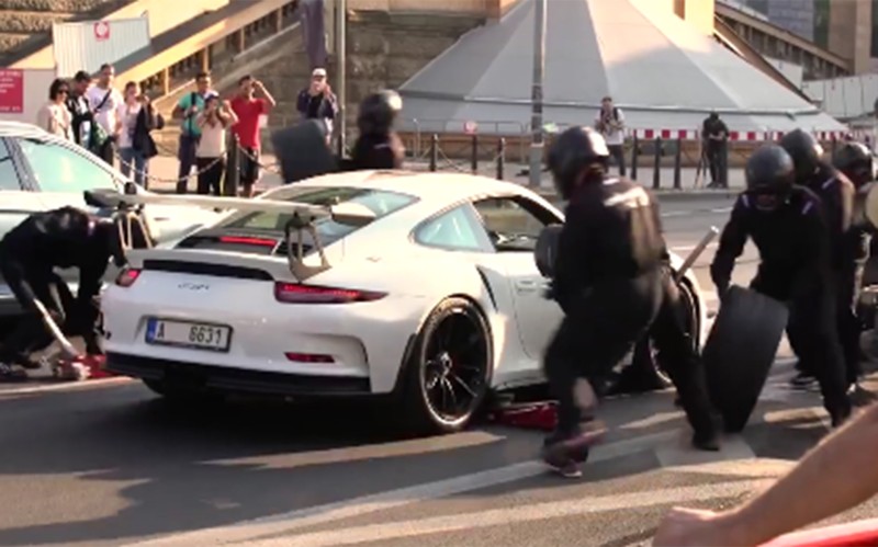 Ένα πολύ ευχάριστο σποτ της Porsche, δείχνει μια 911 GT3 RS η οποία σταματάει σε ένα φανάρι στο κέντρο της πόλης και μια ομάδα μηχανικών πετάγεται στον δρόμο –κατά τη διάρκεια ερυθρού σηματοδότη- και αλλάζει ελαστικά στο ισχυρό γερμανικό μοντέλο. Η εταιρεία θέλει να δείξει ότι ένα αυτοκίνητο όπως την GT3 RS μπορεί να χρησιμοποιηθεί τόσο στην καθημερινότητα όσο και στην πίστα.