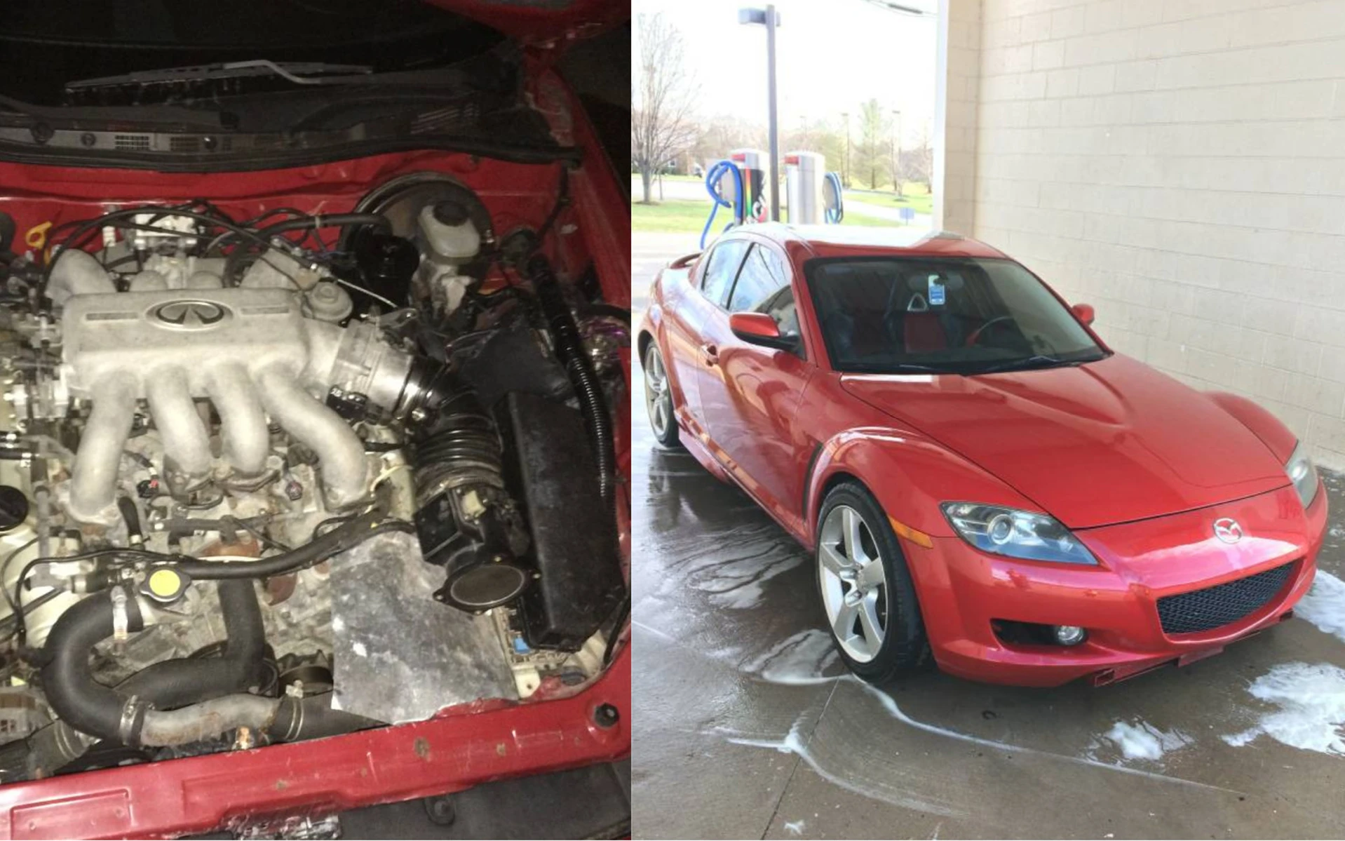 Πολλές είναι οι φήμες που λαμβάνουμε σχετικά με την επιστροφή του περιστροφικού κινητήρα Wankel, αλλά όπως βλέπουμε σε αγγελία του εξωτερικού, κάποιος δεν μπορούσε να περιμένει άλλο και χρειαζόταν επειγόντος… νέο κινητήρα. Αποφάσισε τελικά, παρέα με τον μηχανικό του να τοποθετήσουν μέσα σε ένα RX-8 έναν V8 κινητήρα 4.5 από Infiniti. Συγκεκριμένα, το μοτέρ προέρχεται από ένα Infiniti Q45 από το 1994.