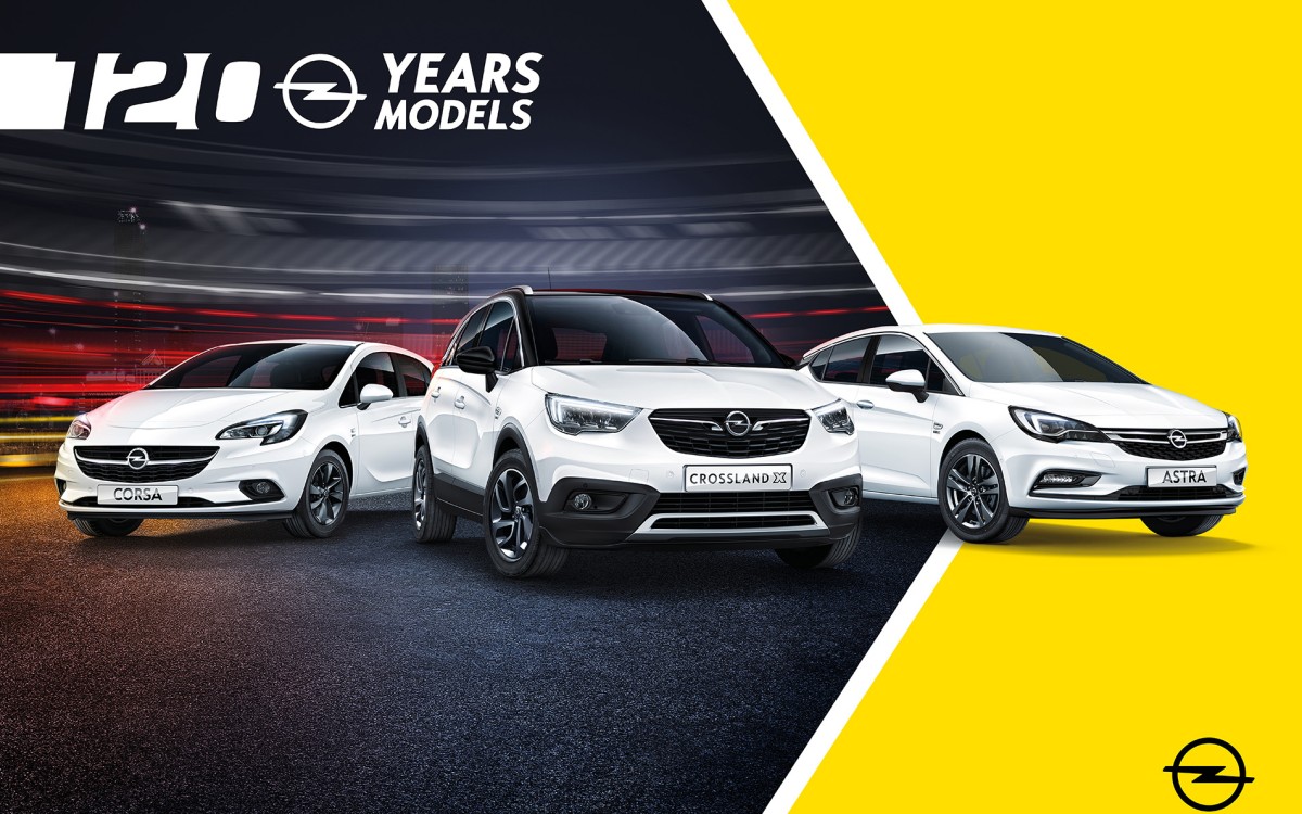 Οι επετειακοί εορτασμοί συμπληρώνονται από εκδόσεις μοντέλων “120 Years” . Αυτές οι ειδικές εκδόσεις των Opel Corsa, Astra, Insignia και των SUV Crossland X, Mokka X και Grandland X, προσφέρουν πλούσιο εξοπλισμό υψηλής τεχνολογίας, ιδιαίτερα στιλιστικά χαρακτηριστικά και συστήματα άνεσης. Τα αυτοκίνητα παίζουν πρωταγωνιστικό ρόλο στην καμπάνια στην τηλεόραση και το διαδίκτυο και συνοδεύονται από οικονομικές προσφορές και προτάσεις χρηματοδότησης. Στη Γερμανία, οι διαφημίσεις θα δίνουν επίσης το «παρών» στους εγχώριους αγώνες της Bundesliga των εταίρων της Opel Borussia Dortmund 09 και 1. FSV Mainz 05.
