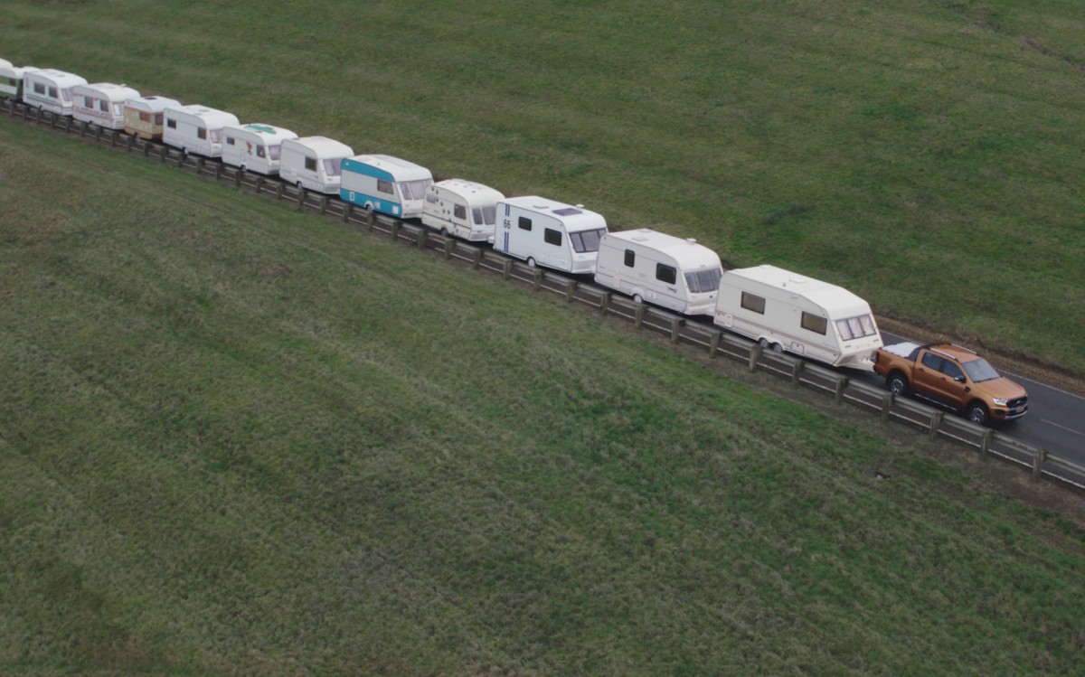 Ευτυχώς που κάτι τέτοιο μπορεί να συμβεί μόνο σε κλειστό δρόμο και μόνο για τις ανάγκες δημιουργίας του συγκεκριμένου video. Αλλιώς, πώς μπορείς να προσπεράσεις ένα Ranger που ρυμουλκεί 15 τροχόσπιτα;