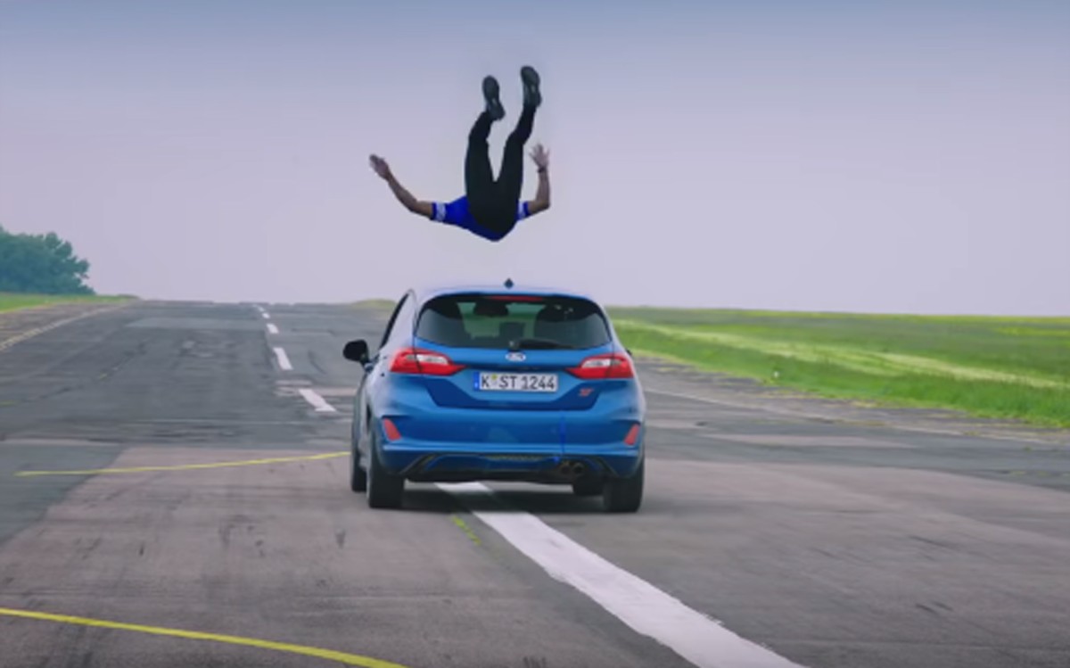 Πιο συγκεκριμένα, ο Hammond πήρε το Ford Fiesta ST και επιχειρεί τρία τρελά ακροβατικά, που περιλαμβάνουν ένα άλμα πάνω από κινούμενο αυτοκίνητο, έναν σχοινοβάτη και έναν… «βαρκάρη».
