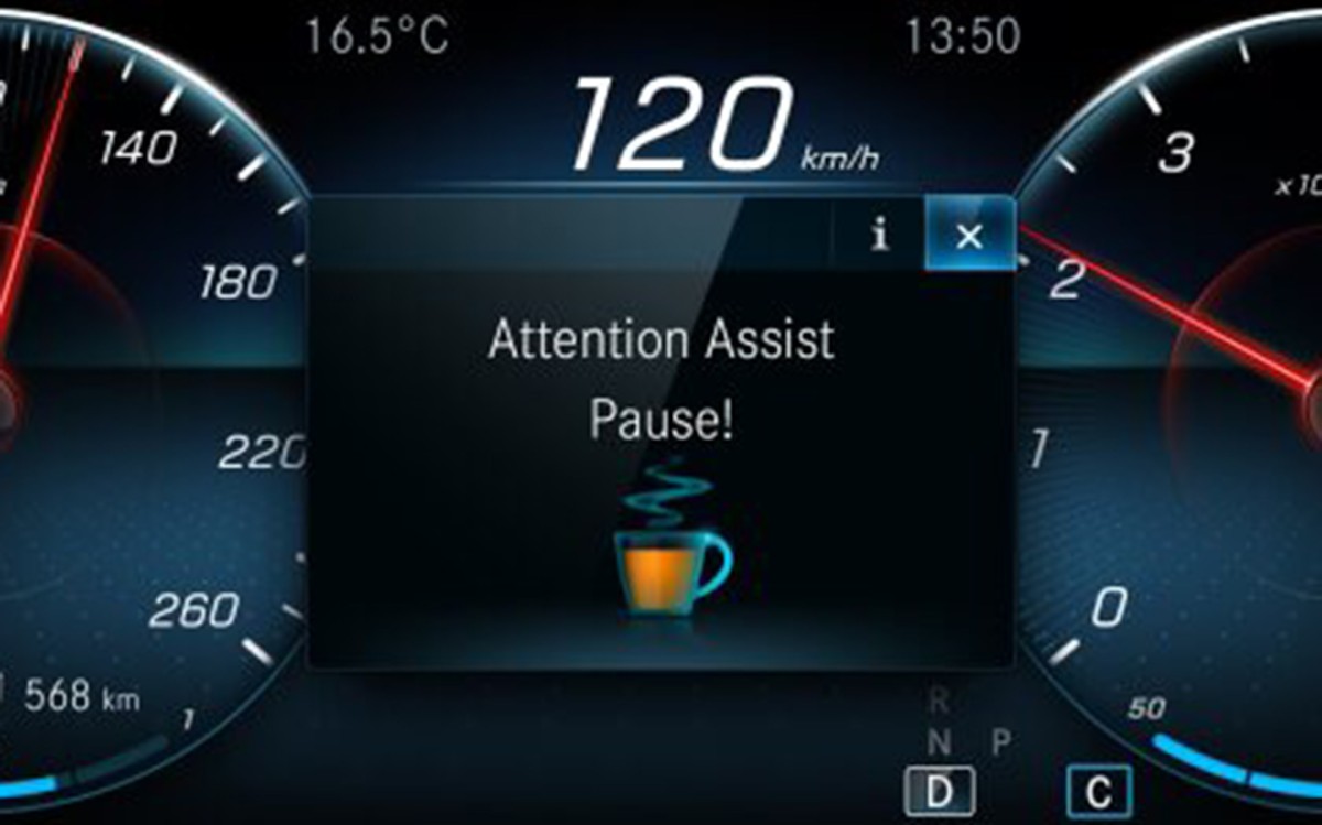 Τι μεσολαβεί, όμως, από τη σταδιακή… εξουθένωσή μας, έως την προτροπή της Mercedes-Benz για ένα αναζωογονητικό διάλειμμα; Μια σειρά αισθητήρων ανιχνεύει την κόπωση –κυρίως βάσει της συμπεριφοράς του οδηγού στο τιμόνι- και στη συνέχεια διενεργείται η ενημέρωση του τελευταίου μέσω μιας ένδειξης σε σχήμα κούπας καφέ στον ψηφιακό πίνακα οργάνων.