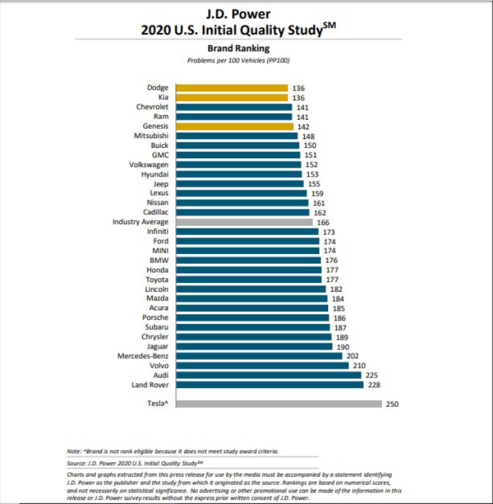 - Η Tesla που συμμετείχε για πρώτη φορά στην διαδικασία, έλαβε το χειρότερο σκορ: 250 PP100. Αν αναλογιστούμε πως η κορυφαίες μάρκες είχαν σκορ της τάξης των 136 PP100 (Kia, Dodge), η Tesla έχει δρόμο μπροστά της. Μάλιστα, σύμφωνα με την J.D. Power, δεν μπόρεσε να γίνει πλήρη έρευνα και αξιολόγηση, καθώς η Tesla δεν έδωσε έγκριση για έρευνα των ιδιοκτητών σε όλες τις πολιτείες των ΗΠΑ, όπως συμβαίνει με τις υπόλοιπες μάρκες.