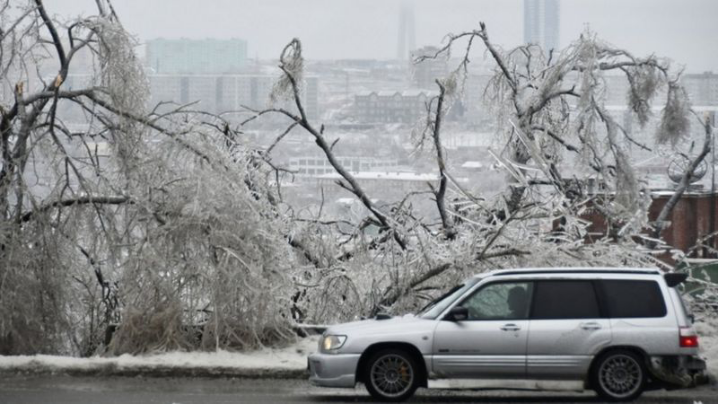Σύμφωνα με τις αρχές, σε πολλά σπίτια το ρεύμα μπορεί να κάνει μέρες να αποκατασταθεί. Μετεωρολογικές υπηρεσίες λένε πως η σύγκρουση δύο καταιγίδων, μίας που έφερε ζεστό αέρα και μίας με παγωμένο, είχε ως αποτέλεσμα την παγωμένη βροχή της Πέμπτης. Το πάχος του πάγου πάνω στα δέντρα και τις κολώνες ηλεκτροδότησης έχει φτάσει τα 1,2 εκατοστά. Πρόκειται για φαινόμενο, που έχουν να το δουν για πάνω από 30 χρόνια.