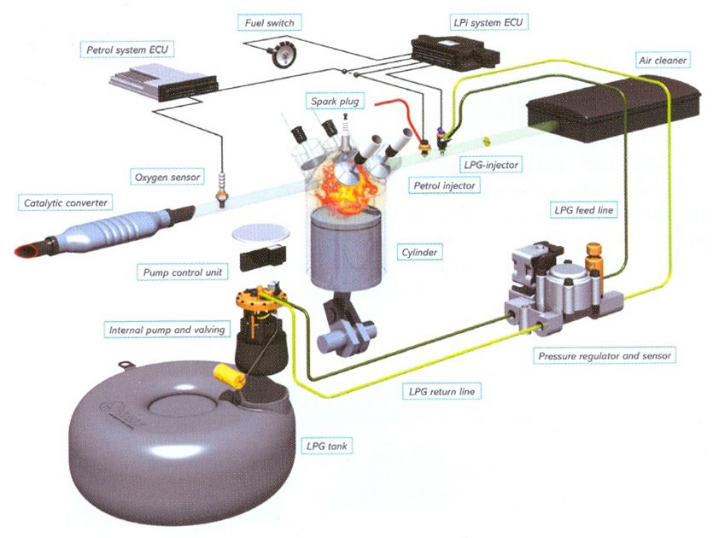 Το σύστημα υγραεριοκίνησης τοποθετείται εντός του αυτοκινήτου και στον χώρο που καταλαμβάνει ο εφεδρικός τροχός ανάγκης ο οποίος αντικαθίσταται με ειδικό κιτ επισκευής ελαστικών.