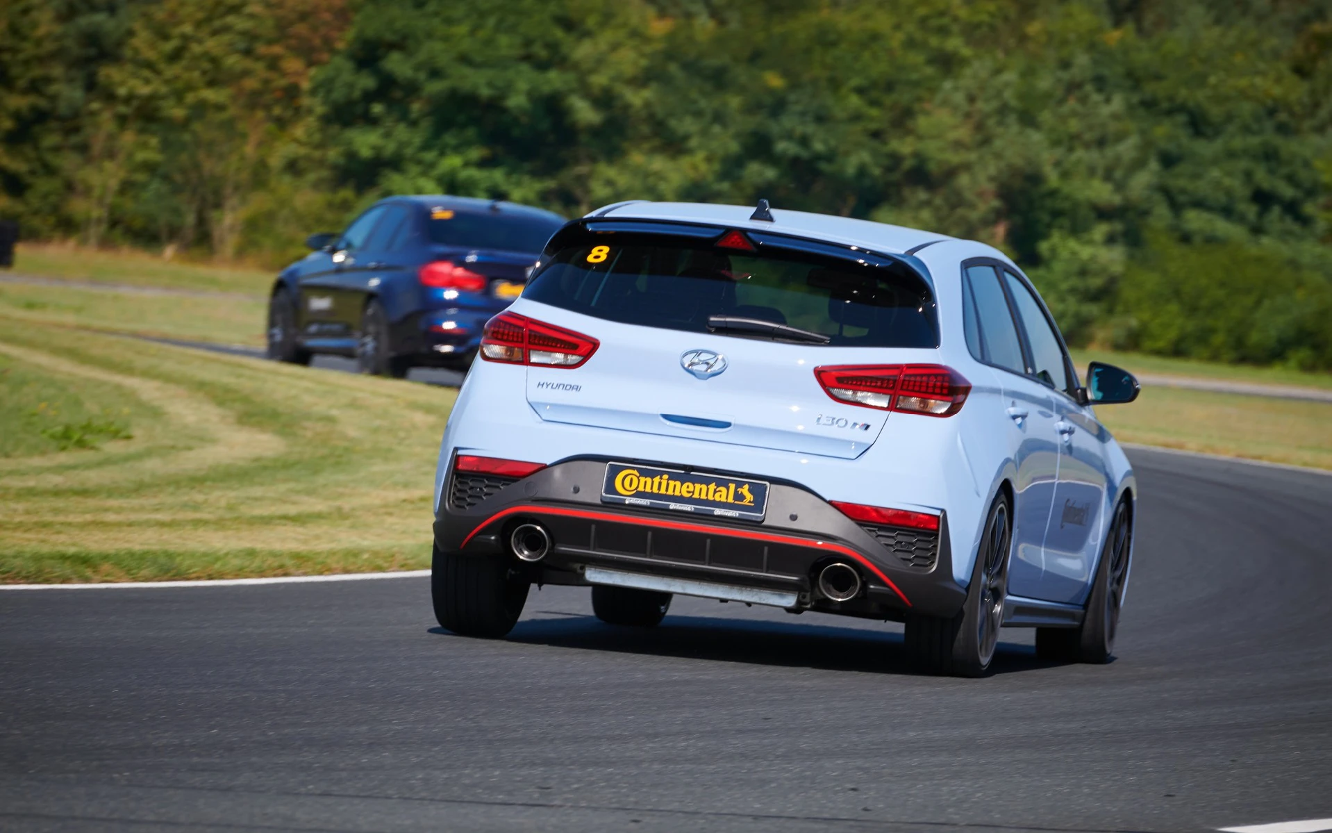 Στη στεγνή πίστα με τη σχετικά γρήγορη χάραξη και τις στροφές των 80-130 km/h, τα νέα Continental SportContact 7 ήταν φορεμένα σε δύο αυτοκίνητα με διαφορετικό χαρακτήρα, αλλά εξίσου μεγάλες απαιτήσεις από τα λάστιχά τους. Στο προσθιοκίνητο Hyundai i30 N των 280 PS συνεργάζονταν άψογα με το ελεγχόμενο διαφορικό και φρόντιζαν κάθε πάτημα του γκαζιού με το τιμόνι στριμμένο να μην οδηγεί σε υποστροφή, αλλά σε κλείσιμο του εμπρός μέρους προς το εσωτερικό της στροφής. Αυτό το ούτως ή άλλως απολαυστικό hatchback έμοιαζε να είναι σε καλύτερη φόρμα από ποτέ, αφού το πλασάρισμα με μεγάλη ταχύτητα και η ακροβασία στο όριο της πρόσφυσης, γινόταν με ακρίβεια και σιγουριά.