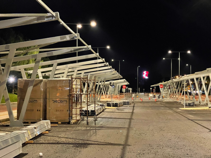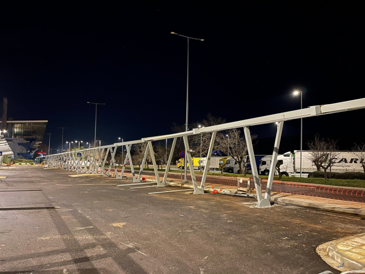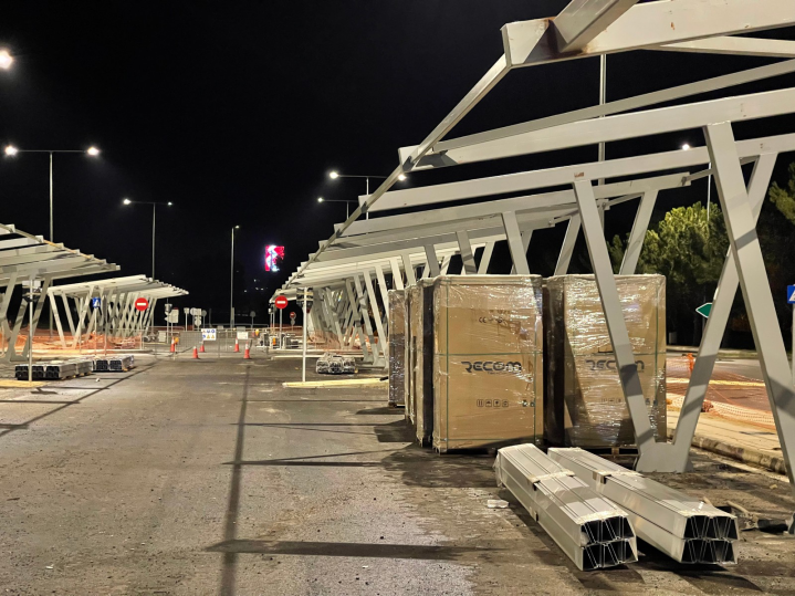 Τα πάνελ της γαλλικής Recom βρίσκονται ακόμη στα κουτιά, καθώς πρώτα πρέπει να ολοκληρωθεί το στέγαστρο. Το φωτοβολταϊκό πάρκο θα έχει συνολική ισχύ 500 kWp, συλλέγοντας ενέργεια από τον ήλιο και αποθηκεύοντάς την, ώστε να τη μεταφέρει στους φορτιστές και από εκεί στις μπαταρίες των αυτοκινήτων.