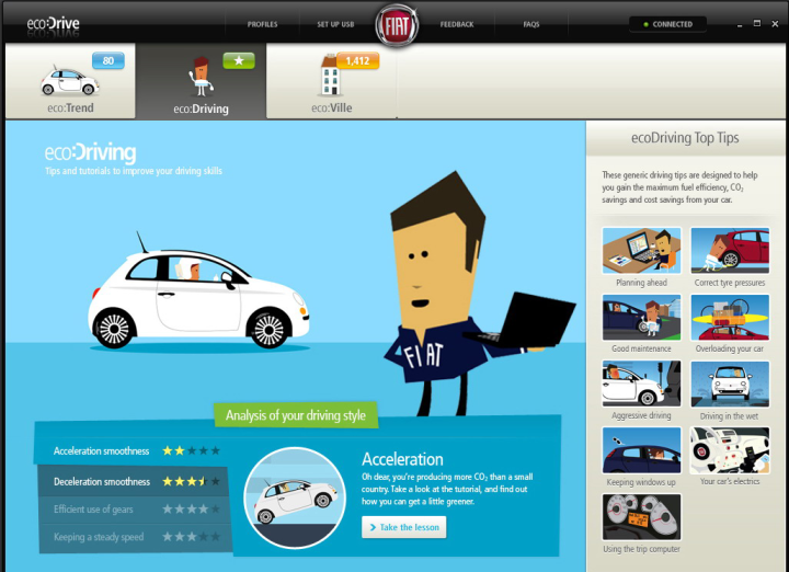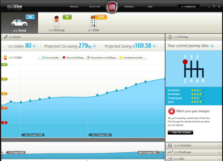 Η εφαρμογή eco:Drive δίνει στο χρήστη τη δυνατότητα να συλλέξει τα στοιχεία σχετικά με την οδήγηση μέσω της θύρας USB του συστήματος Blue&Me που έχει εγκατασταθεί στο αυτοκίνητο. Αφού το ''κατέβασαν'' 140.000 φορές και το χρησιμοποίησαν κανονικά περισσότεροι από 50.000 οδηγοί, το λογισμικό έστειλε τα δεδομένα περίπου δέκα εκατομμυρίων διαδρομών στον server της Fiat ο οποίος τα επεξεργάστηκε για να μετρήσει την απόδοση της οδήγησης βάσει τεσσάρων παραμέτρων: