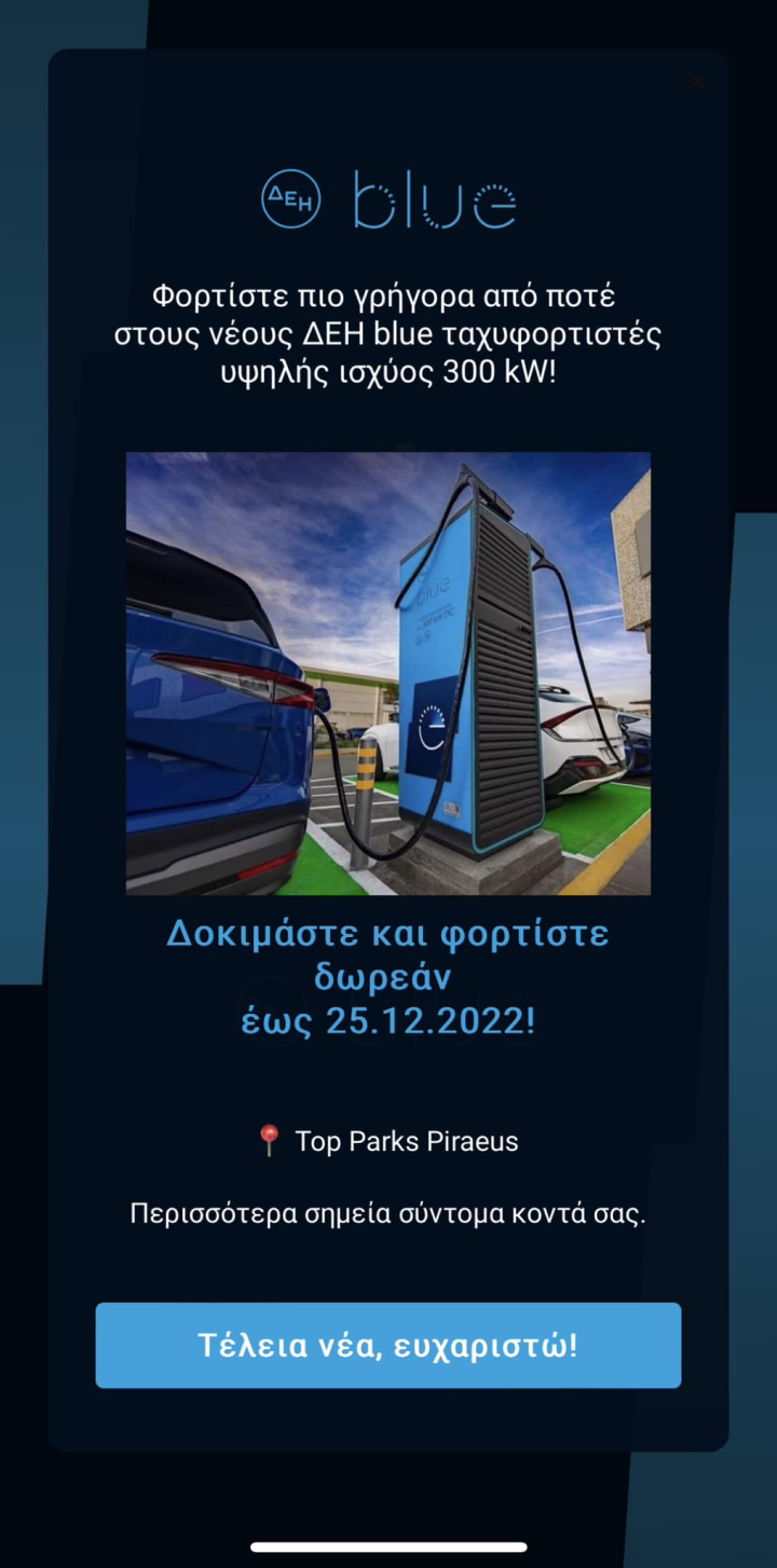 Ο νέος φορτιστής έχει τοποθετηθεί στη λεωφόρο Αθηνών – Πειραιώς 86, στο εμπορικό κέντρο Top Parks. Η τοποθέτησή του συνοδεύτηκε από μία προσφορά της DEI blue, καθώς μέχρι και τα Χριστούγεννα η φόρτιση εκεί θα είναι δωρεάν. Εκτός από λόγους γνωριμίας με το κοινό, αυτή η κίνηση της DEI blue βοηθά και στην αξιοπιστία του φορτιστή, καθώς ο αυξημένος αριθμός φορτίσεων που θα γίνουν λειτουργεί ως δυνατό crash test.