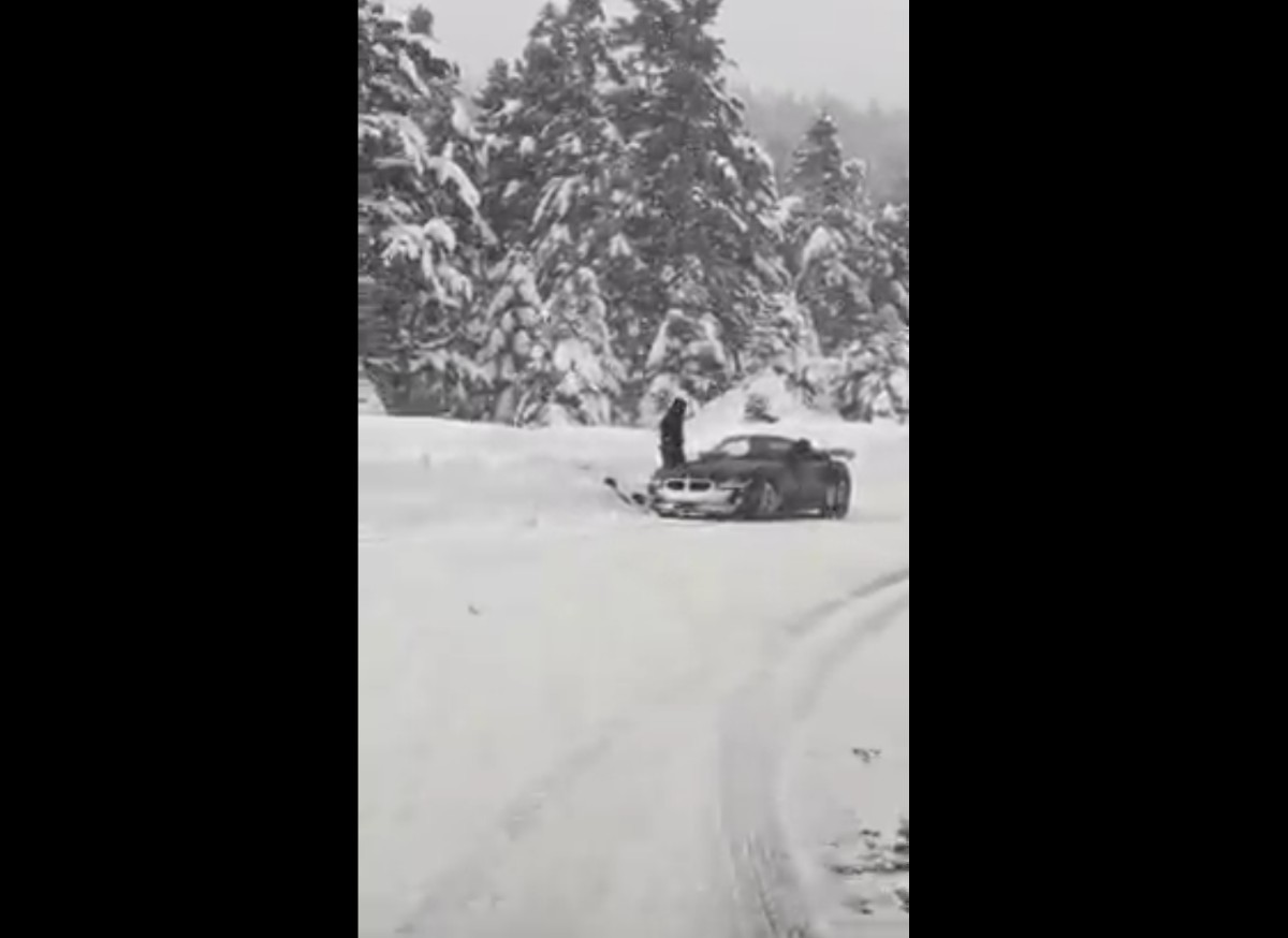 Ο οδηγός ενός BMW Z4, ο οποίος προφανώς είχε επισκεφθεί το χιονοδρομικό, κατέβαινε από το βουνό. Παρά τις δυσμενείς καιρικές συνθήκες που επικρατούσαν, κυκλοφορούσε με την οροφή ανοικτή, θαρρείς και βόλταρε στην παραλιακή. Το αυτοκίνητο φαίνεται ακινητοποιημένο στο παγωμένο οδόστρωμα, αν και φοράει χιονοκουβέρτες στους πίσω τροχούς.