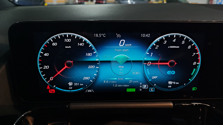 Σαν τελευταίο στάδιο του «πειράματος κατανάλωσης ενός PHEV» με τη Mercedes-Benz GLA 250 e, αφήσαμε την κίνηση με τις μπαταρίες πλήρως αποφορτισμένες. Κινηθήκαμε πρωί, στους… πηγμένους δρόμους της Αθήνας, για να δούμε τι θα γράψει το trip computer. Όπως βλέπουμε, η συνολική απόσταση που διανύσαμε ήταν 11 χιλιόμετρα, με τη μέση κατανάλωση καυσίμου να βρίσκεται στα 9,4 λίτρα ανά 100 km.