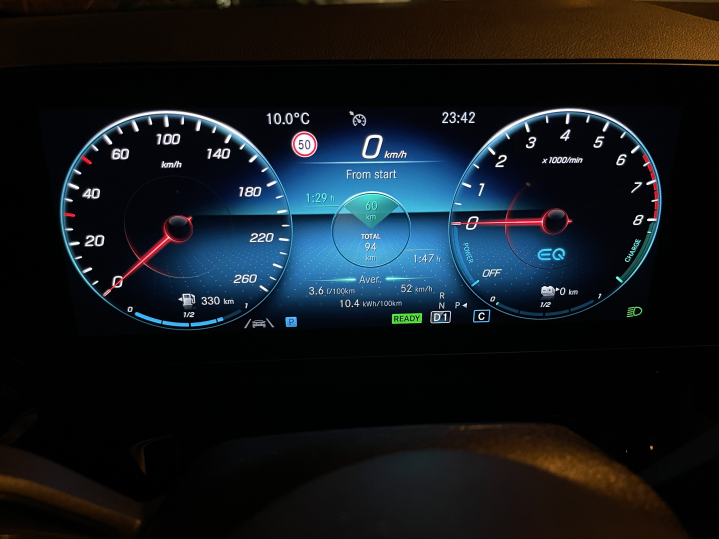 Στην παραπάνω φωτογραφία, βλέπουμε πόσο καύσιμο χρειάστηκε η GLA «μας» σε έναν κύκλο περίπου 100 χιλιομέτρων. Ξεκινήσαμε την οδήγηση με φουλ φορτισμένη την μπαταρία, οπότε από τα 94 χιλιόμετρα που καλύφθηκαν συνολικά, τα 60 έγιναν με ηλεκτρική ενέργεια. Η μέση κατανάλωση βενζίνης ήταν μόλις 3,6 lt/100 km! Από την άλλη, η κατανάλωση ρεύματος ήταν 10,4 kWh/100 km. Άρα, όταν οι μπαταρίες είναι γεμάτες, το υβριδικό σύστημα στην αυτόματη λειτουργία πραγματοποιεί εξαιρετική διαχείριση των αποθεμάτων καυσίμου και ρεύματος, με στόχο τη χαμηλότερη κατανάλωση.