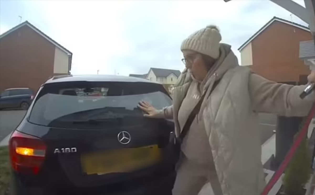 Η κυρία ξέχασε να τραβήξει το χειρόφρενο και η Mercedes A-Class κύλησε προς τα πάνω της, σφηνώνοντάς τη στην πόρτα του σπιτιού.