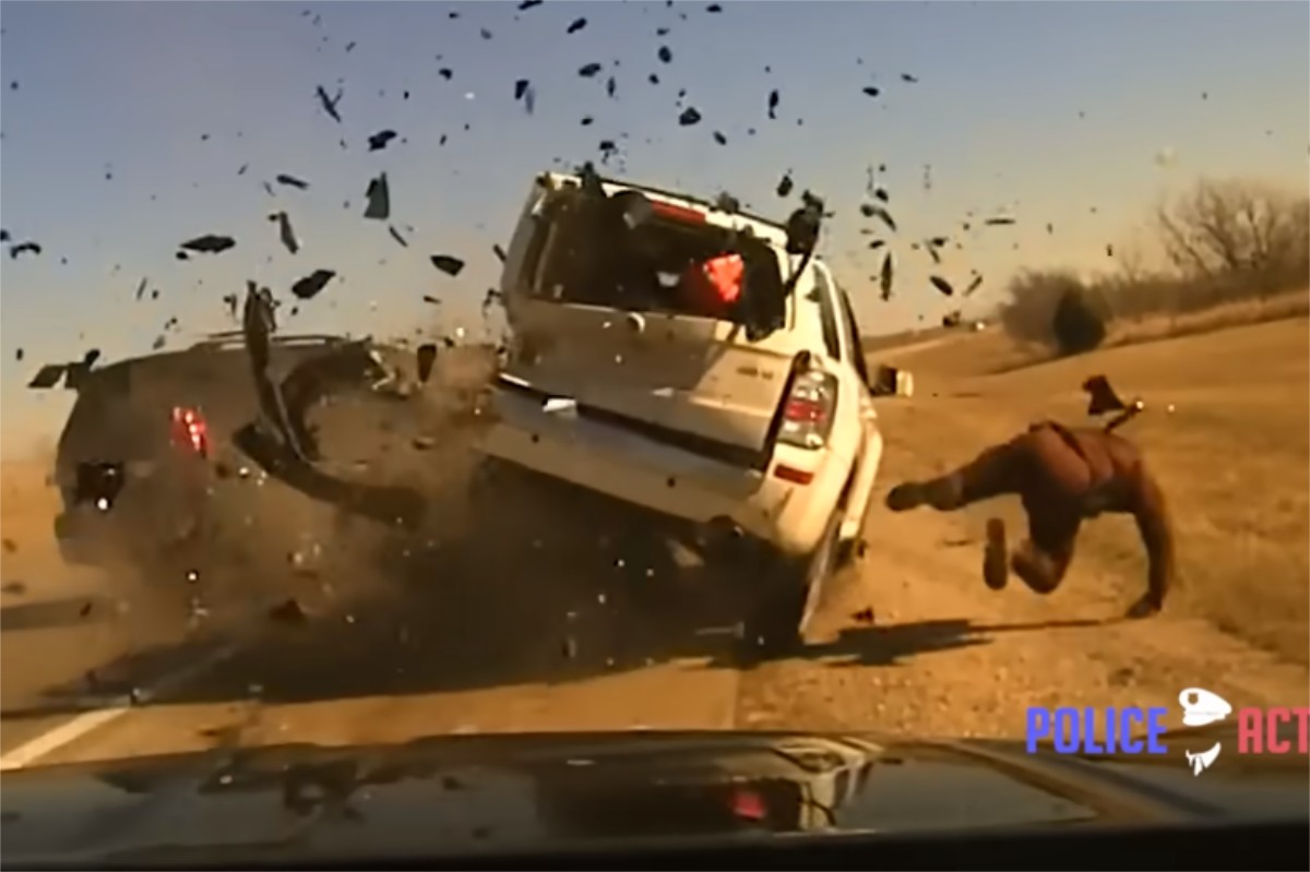 Ο Jesse Gregory, έκανε έλεγχο σε ένα όχημα στον Interstate 40 στην Οκλαχόμα των ΗΠΑ, όταν ένα μεγάλο SUV εμφανίστηκε άξαφνα από πίσω και προσέκρουσε στο ακινητοποιημένο αυτοκίνητο. Το όργανο της τάξης εκτινάχθηκε προς τα χωράφια, με το μαύρο SUV να τουμπάρει και το άλλο να διαλύεται από την αριστερή πλευρά.