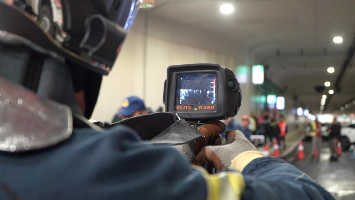 Όπως διαπιστώσαμε κατά την άσκηση, ο καπνός είναι τόσο έντονος και καλύπτει τη σήραγγα σε λιγότερο από 2 λεπτά. Αν παρέλθει αυτός ο χρόνος, όποιος βρίσκεται στο τούνελ, κινδυνεύει από ασφυξία. Γι΄αυτό και κάθε πυροσβέστης που επιχειρεί φορά την ειδική στολή, διαθέτει εξάρτηση και οξυγόνο. Η θερμική κάμερα βοηθά ώστε να αναγνωρίσει τα θερμικά φορτία ώστε να προσεγγίσουν με ακρίβεια οι υπόλοιπες δυνάμεις το σημείο με τη φωτιά μέσα στον πυκνό καπνό.
