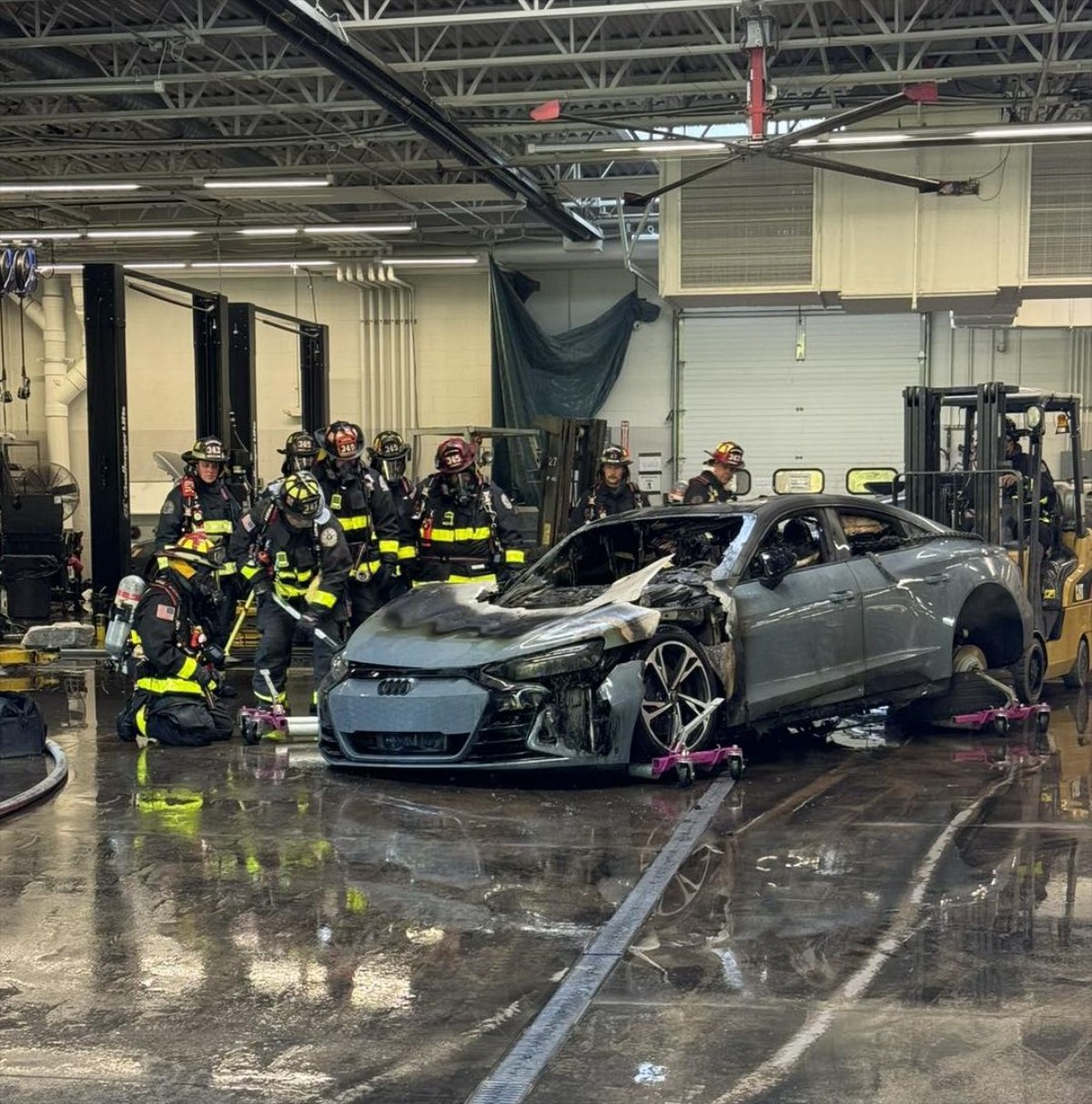 Για την κατάσβεση βέβαια του e-tron GT χρειάστηκαν κάμποσες ώρες και η συνδρομή ενός περονοφόρου ανυψωτικού μηχανημάτος (κλαρκ) το οποίο, όταν η φωτιά είχε τεθεί υπό σχετικό έλεγχο, «άρπαξε» το αυτοκίνητο και το έβγαλε στο προαύλιο χώρο της έκθεσης για να το σβήσουν τα πυροσβεστικά οχήματα.