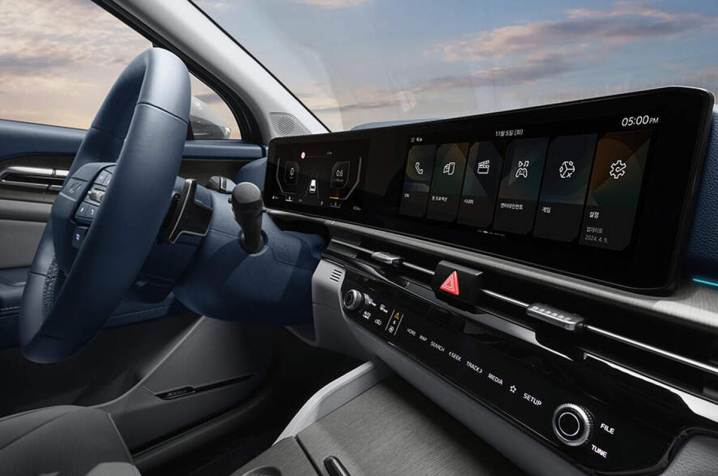 Στη καμπίνα, παρατηρούμε πως και εδώ υπάρχουν κοινά στοιχεία με τη σειρά EV της Kia. Τις εντυπώσεις και τα βλέμματα κλέβει η νέα κυρτή οθόνη αφής σε διάσταση 12,3’’, η οποία εφοδιάζεται με τη νεότερη γενιά του συστήματος πολυμέσων της κορεάτικης φίρμας. Συνδέεται κάτω από μία ενιαία γυάλινη επιφάνεια με τον ψηφιακό πίνακα οργάνων, δημιουργώντας μία καλαίσθητη και φουτουριστική εικόνα. Νέα σχεδίαση έχει το τιμόνι με τις δύο ακτίνες, ενώ μία μπάρα φωτισμού LED στη κεντρική κονσόλα συμβάλλει στη δημιουργία ενός ατμοσφαιρικού περιβάλλοντος. Επιπλέον, στην κατασκευή της καμπίνας έχει γίνει χρήση νέων υλικών, τα οποία με τη σειρά τους συμβάλλον στην περαιτέρω βελτίωση της ηχομόνωσης και στο ακόμα πιο χαμηλό επίπεδο θορύβου.