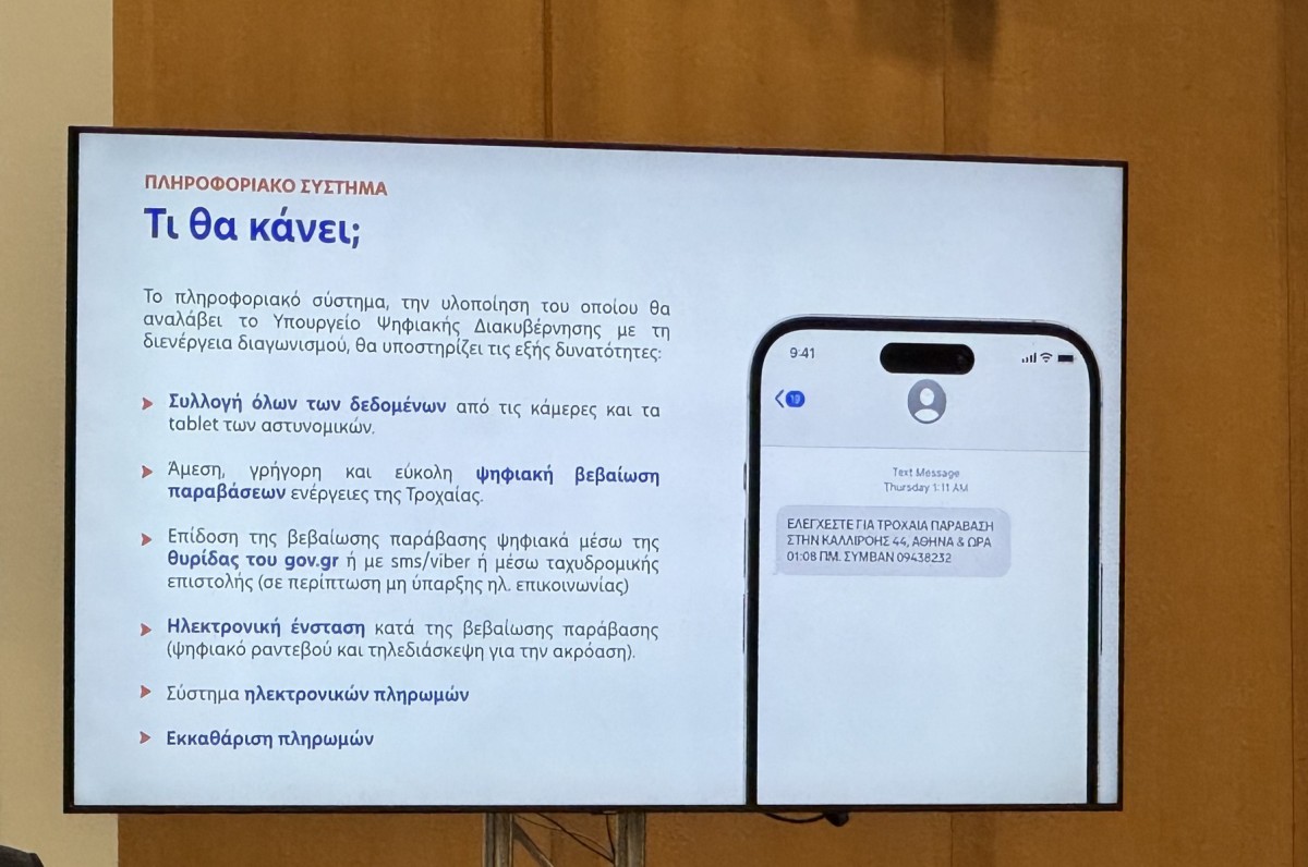 «Από την ώρα που είστε εγγεγραμμένοι στο εθνικό μητρώο επικοινωνίας θα έρχεται ένα SMS ότι ελέγχεστε για παράβαση και την ίδια ώρα το υλικό, όπως φωτογραφίες και βίντεο, θα πηγαίνει στην ΕΛΑΣ. Έπειτα θα έρχεται στη θυρίδα - που θα ενσωματωθεί στο wallet του gov.gr – το βίντεο και φωτογραφία της παράβασης και θα δίνεται η δυνατότητα είτε πληρωμής είτε αμφισβήτησης», τόνισε ο Δημήτρης Παπαστεργίου.