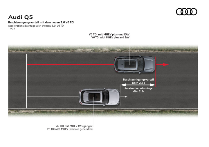 Σε… πείσμα των καιρών, που απαιτούν ηλεκτροκίνηση προς κάθε κατεύθυνση, η Audi παρουσιάζει έναν νέο 3.0 lt V6 diesel για τα Q5 και A6, με ισχύ 299 PS και 580 Nm, δημιουργώντας ένα σύνολο που τοποθετείται πάνω από κάθε προηγούμενο TDI της μάρκας. Η σημαντικότερη τεχνολογική εξέλιξη είναι η ενσωμάτωση της MHEV plus υβριδικής διάταξης, στοιχείο που αλλάζει τη συμπεριφορά του κινητήρα σε όλα τα φορτία.
