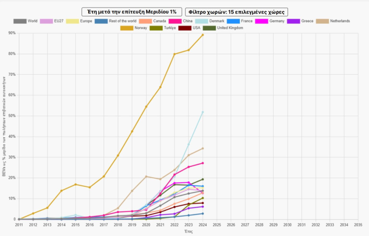 Για να απαντήσουμε στο ερώτημα που θέσαμε στην αρχή, μέχρι σήμερα οι πωλήσεις των ηλεκτρικών αυτοκινήτων στην Ελλάδα παραπέμπουν σε μία secular bull αγορά, αλλά με δύο έντονες rally περιόδους. Για τα επόμενα χρόνια, ο secular bull χαρακτήρας αναμένεται να συνεχιστεί. Αυτό σημαίνει ότι θα εμφανίζονται περίοδοι μεγαλύτερης ή μικρότερης ανόδου, ενώ δεν αποκλείεται να δούμε κατά διαστήματα και πτώση. Όμως είναι αναπόφευκτο. Σε βάθος χρόνου, το γράφημα της Ελλάδας θα μοιάζει με εκείνα που βλέπουμε στην παραπάνω εικόνα. Θα κινείται ανοδικά. Σημειώνοντας παράλληλα, πως σήμερα οι 6.125 πωλήσεις αφορούν αποκλειστικά τα επιβατικά αυτοκίνητα. Αν προσθέσουμε τα επαγγελματικά και τα ταξί, οι ταξινομήσεις BEVs για το διάστημα Ιανουάριος-Σεπτέμβριος 2025 φτάνουν τις 7.072 μονάδες.