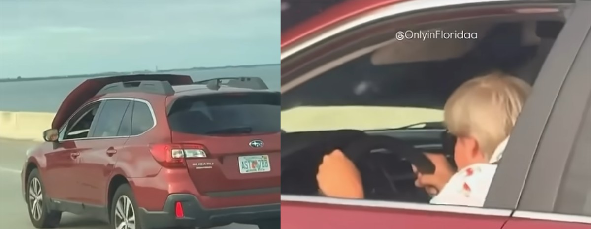Ο οδηγός του Subaru Outback στη Φλόριντα, αποφάσισε να συνεχίσει την πορεία του, παρότι το καπό είχε «κρύψει» σχεδόν όλο το οπτικό πεδίο. Ο ηλικιωμένος άνδρας έσκυψε όσο μπορούσε προκειμένου να βλέπει από το κενό στο κάτω τμήμα του παρμπρίζ, θεωρώντας πως το να ακινητοποιήσει το όχημα πάνω στη γέφυρα μπορεί να χειροτέρευε τα πράγματα.