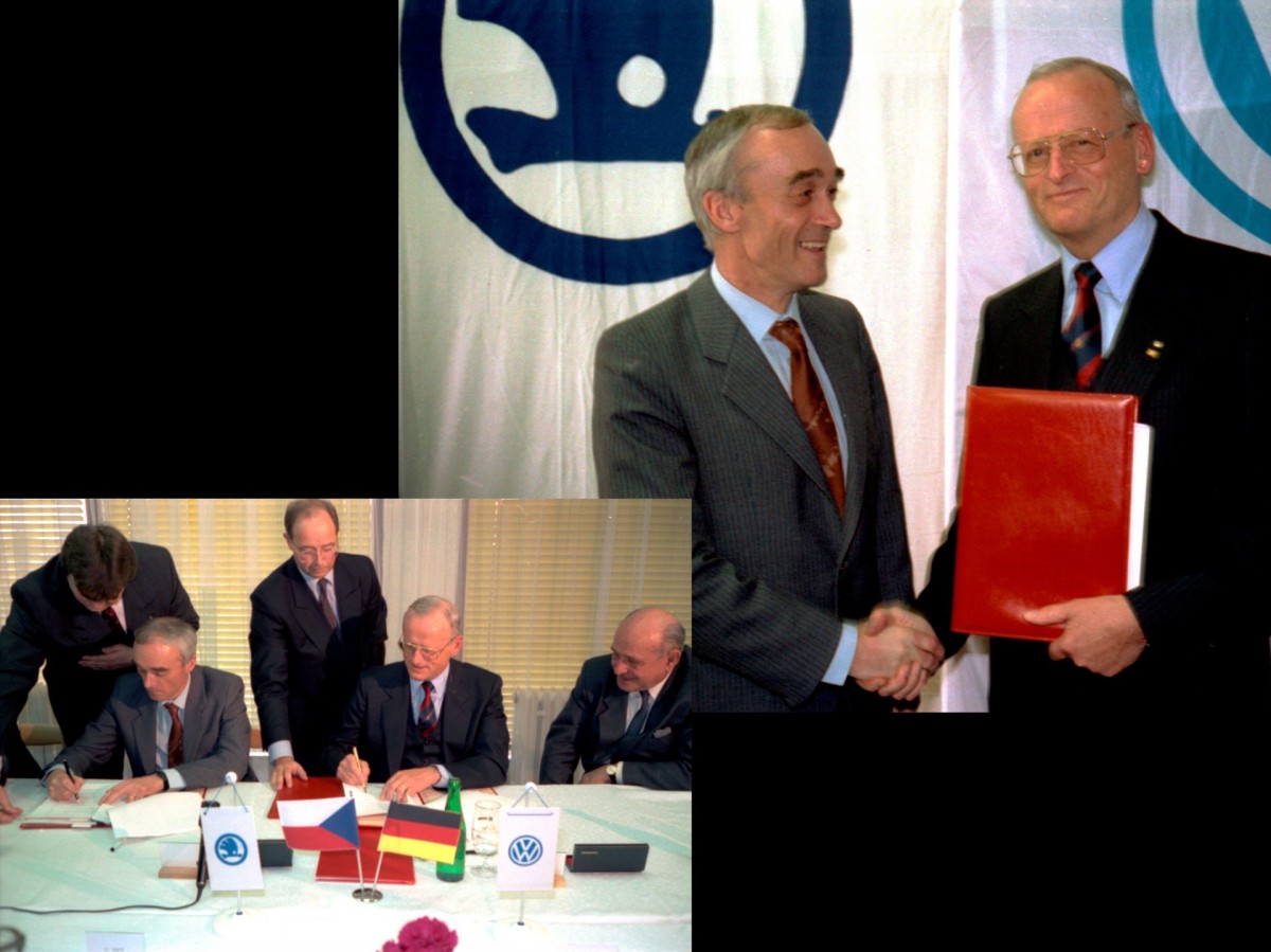 Μετά την πτώση του κομμουνιστικού καθεστώτος στην Τσεχοσλοβακία, τον Νοέμβριο του 1989, έγινε σαφές ότι η Skoda χρειαζόταν έναν ισχυρό στρατηγικό εταίρο, ώστε να μπορέσει να ανταγωνιστεί αποτελεσματικά στην παγκόσμια αγορά. Εκείνη την περίοδο, η ετήσια παραγωγική της δυναμικότητα ανερχόταν περίπου στις 200.000 μονάδες, ενώ η γκάμα της περιοριζόταν σε δύο μοντέλα: το Skoda Favorit και το station wagon Forman. Κατά τη διαδικασία ιδιωτικοποίησης της κρατικής αυτοκινητοβιομηχανίας, η Volkswagen αναδείχθηκε σε έναν από τους βασικούς υποψηφίους μεταξύ 24 πιθανών εταίρων. Η συμφωνία για τη δημιουργία της κοινοπραξίας μεταξύ της τσεχικής κυβέρνησης και του Ομίλου Volkswagen υπογράφηκε στις 28 Μαρτίου 1991 από τον Υπουργό Βιομηχανίας Jan Vrba και τον Πρόεδρο της Volkswagen Carl Hahn. Αφού ο Όμιλος Volkswagen εκπλήρωσε τις συμβατικές του δεσμεύσεις, απέκτησε αρχικά το 31% της Skoda Auto στις 16 Απριλίου 1991, ποσοστό που αυξήθηκε σταδιακά στο 100% έως τις 30 Μαΐου 2000.