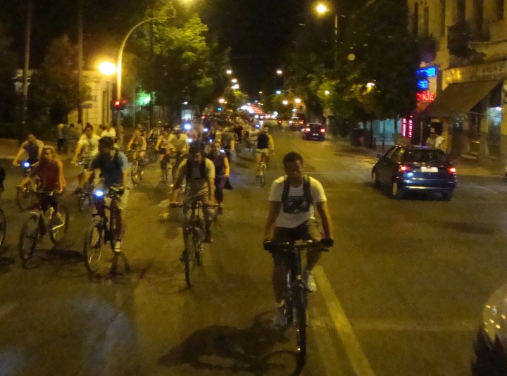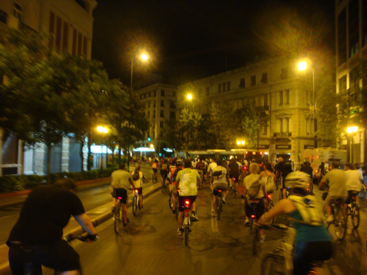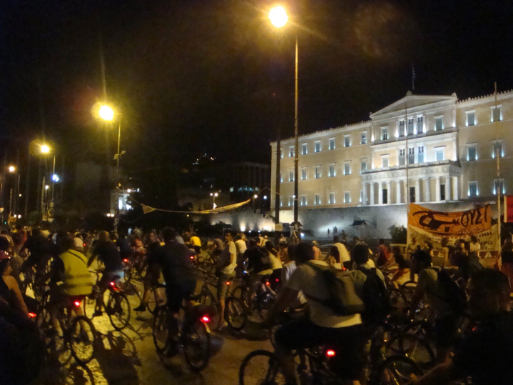 Τα μεσάνυχτα, 12 και κάτι, φτάσαμε πλατεία Γλυφάδας. Πάλι καλά που υπάρχουν αρκετά περίπτερα και μπόρεσαν όλοι να ανεφοδιαστούν. Κάθησα σε ένα παγκάκι και ο κύριος που καθόταν ήδη διαβάζοντας ένα βιβλίο, με ρώτησε: "τι διαδήλωση είναι αυτή; Δεν την ξέρω". "Freeday κάθε Παρασκευή βράδυ και σήμερα είναι το Tour D' Atene", του εξήγησα και σύντομα η αντίδραση ήταν “μπράβο παιδιά”. Το 20λεπτο διάλειμμα τελείωσε και ξεκινήσαμε για τον επόμενο προορισμό, την πλατεία Ελευθερίας στον Κορυδαλλό. Περίπου 25 km, όπου τα περισσότερα είναι παραλιακά. Περάσαμε δίπλα από το Ελληνικό, το Σ.Ε.Φ., το λιμάνι του Πειραιά, την ιχθυόσκαλα του Κερατσινίου και ύστερα… Ύστερα άρχισε η ανηφόρα, μάλλον για να μας προετοιμάσει για το μετά. Η διαδρομή ήταν πολύ διαφορετική από τις συνηθισμένες. Έβλεπες πολύ θάλασσα και λίγες πολυκατοικίες. Στην πλατεία Ελευθερίας φτάσαμε περίπου στις 2 και κάτι. Μια μικρή εξάντληση είχε αρχίσει να εμφανίζεται, αφού λίγο η ζέστη, λίγο η πείνα (5 ώρες πριν το τελευταίο γεύμα), έκαναν το μαρμάρινο σκαλοπάτι μπροστά μου να φαίνεται σαν πολυθρόνα. Δεν το έβαλα κάτω όμως. Στόχος η επιστροφή στο Θησείο μέσω Θρακομακεδόνων και Αγίας Παρασκευής.