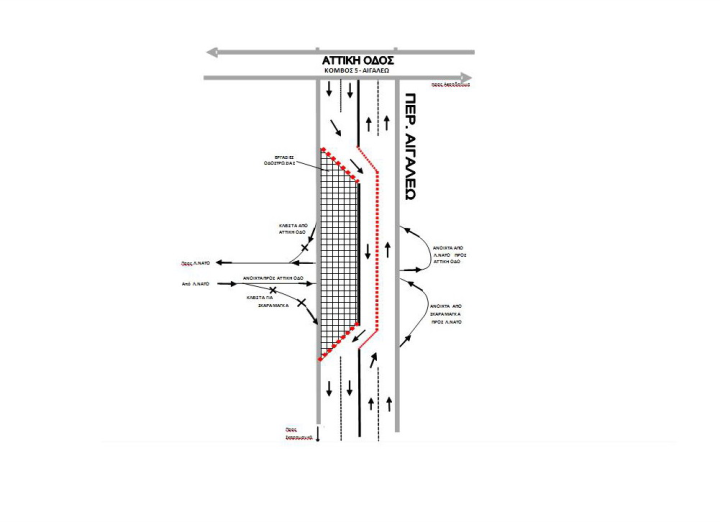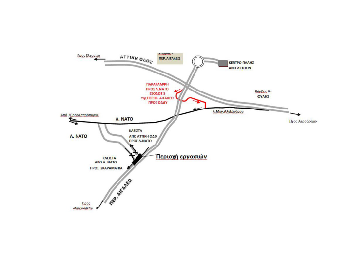 Από Αττική Οδό προς Λ. ΝΑΤΟ: Μετά την είσοδο στην Περιφ. Αιγάλεω τα οχήματα εξέρχονται στην Έξοδο 5 προς ΟΔΔΥ και, ακολουθώντας πληροφοριακή σήμανση που θα τοποθετηθεί, θα καταλήγουν στη Λ. ΝΑΤΟ. Η Έξοδος 5Α της Περιφ. Αιγάλεω προς Λ.ΝΑΤΟ θα παραμείνει κλειστή για όλο το διάστημα των εργασιών.